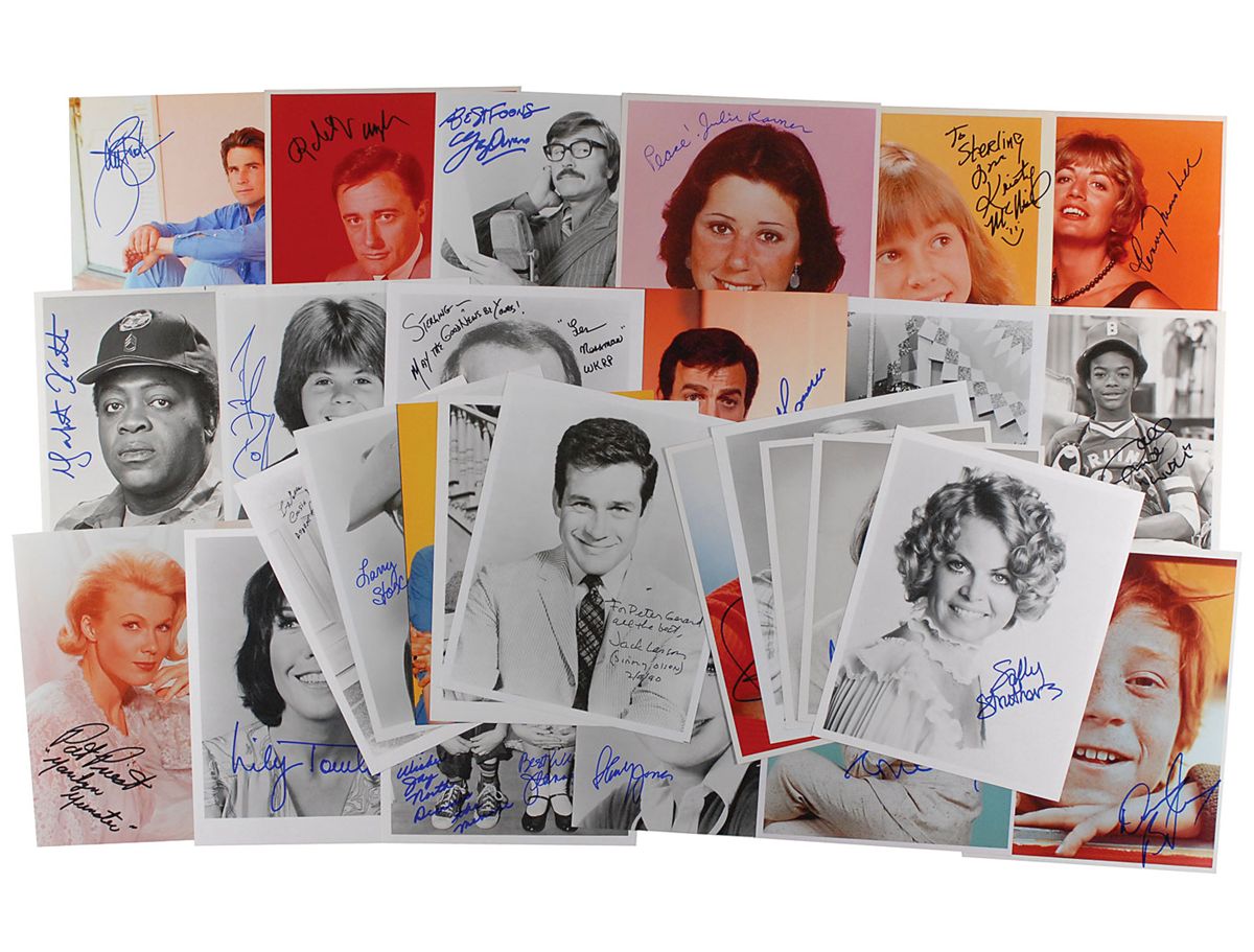 Collection of 28 photos, almost all 8 x 10, each signed in ink or felt tip by the actor or actress pictured. Signers are: Danny Bonaduce, Todd Bridges, James Brolin, Mike Connors, Tim Conway, Arte Johnson (3), Shirley Jones, Julie Kavner, Yaphet Kotto, Jack Larson (ins), Penny Marshall, David McCallum, Kristy McNichol (ins), Jaye P. Morgan, Jay North and Jeanne Russell, Gary Owens, Pat Priest, Adam Rich, Richard Roundtree, Richard Sanders (ins), Felix Silla, Larry Storch, Sally Struthers, Lily Tomlin, Robert Vaughn, and Cindy Williams and Penny Marshall. In fine condition.
