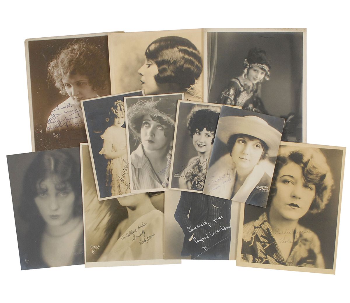 Collection of 11 vintage photos, 4.5 x 7 to 8 x 10, each signed by the actor or actress pictured, including: Sally O’Neil, Ann Little, May Allison, Alberta Vaughn (ins), Bryant Washburn, Pauline Starke, Ruth Roland (ins), Hazel Dawn (ins), Madge Bellamy (ins), and Viola Dana (2). Some light creases and trimmed edges, and scattered specks of surface loss to one photo, otherwise overall fine condition.