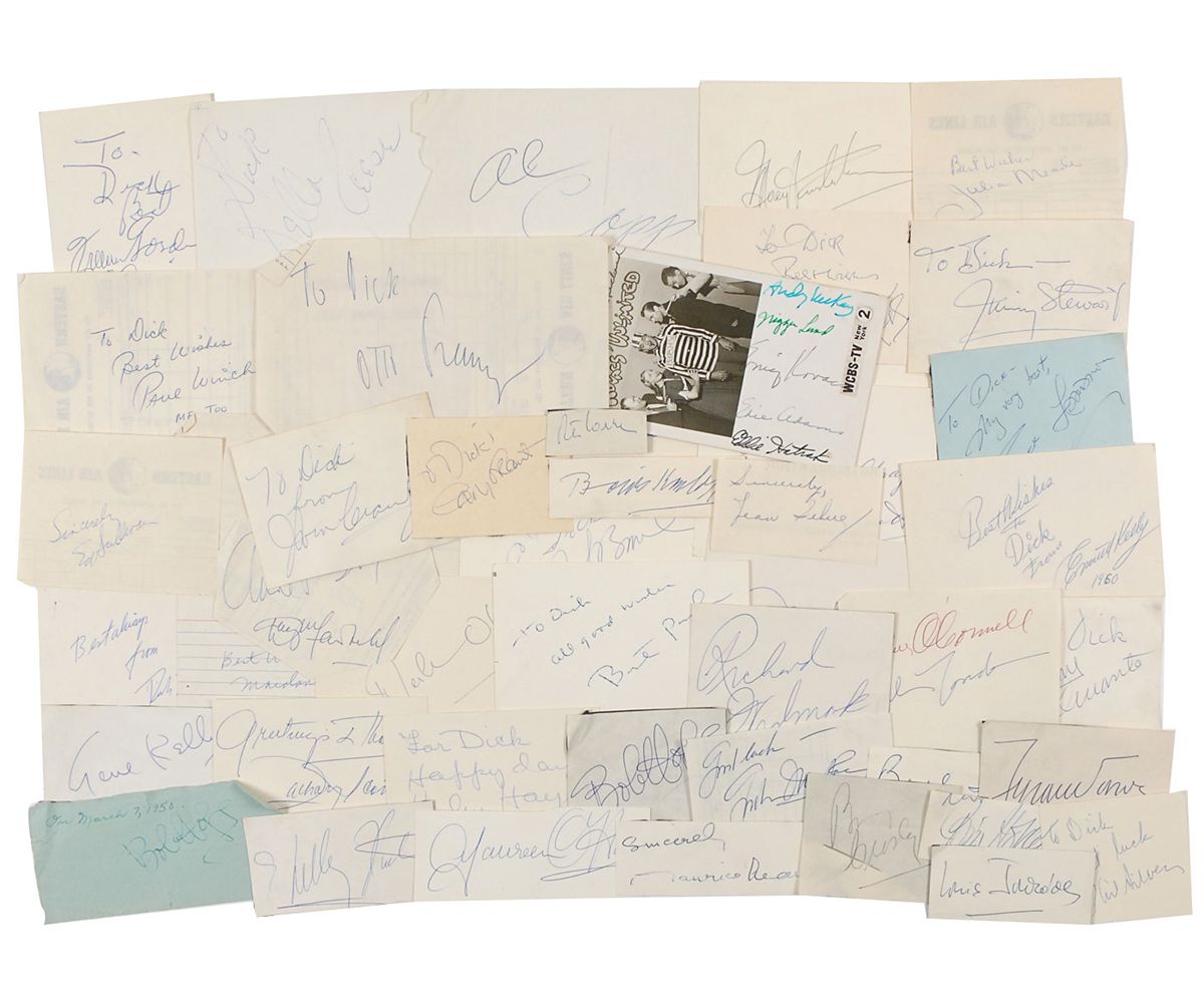 Collection of 53 signatures of actors and actresses on various slips and cards, some inscribed, with highlights including Cary Grant, Boris Karloff, Ernie Kovacs (and cast members of Kovacs Unlimited, SP), Peter Lorre, and Joan Crawford. Additional signers are: Morey Amsterdam, Anne Baxter, Bruce Bennett, Pat Boone, Keefe Brasselle, Al Capp, Macdonald Carey, Jackie Cooper, Bing Crosby, Joanne Dru, Jimmy Durante, Maurice Evans, Douglas Fairbanks, Jr., Mel Ferrer, Freeman Gosden, June Havoc, Helen Hayes, William Holden, Bob Hope (2), John Ireland, Burl Ives, Louis Jourdan, Emmett Kelly, Gene Kelly, Deborah Kerr, Eartha Kitt, Burt Lancaster, Jack Lemon, Julie London, Gordon MacRae, Julia Meade, Ricky Nelson, Arthur O’Connell, Maureen O’Hara, Merle Oberon, Bert Parks, Tyrone Power, Otto Preminger, Della Reese, Zachary Scott, Jean Seberg, Phil Silvers, James Stewart, Ed Sullivan, Richard Widmark, Paul Winchell, and Shelley Winters. In overall very good to fine condition.