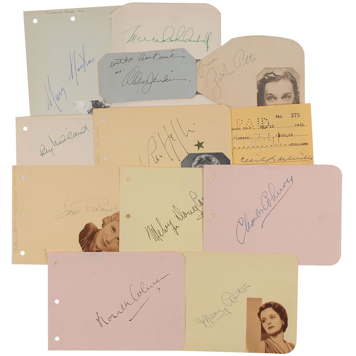 Collection of twelve ink and fountain pen signatures from various actors and actresses, primarily consisting of 6 x 4.25 album pages bearing affixed images of the signers, including: Ronald Colman, Mary Astor, Charles Coburn, Melvyn Douglas, Joan Fontaine, Van Heflin, Mary Martin, Mercedes McCambridge, Ray Milland, Allen Jenkins (slip), Zasu Pitts (slip), and Cecil B. DeMille (check). In overall fine condition, with light creasing, trimmed corners and edges to the slips, and a vertical fold, and expected bank stamps and cancellation holes to the check.