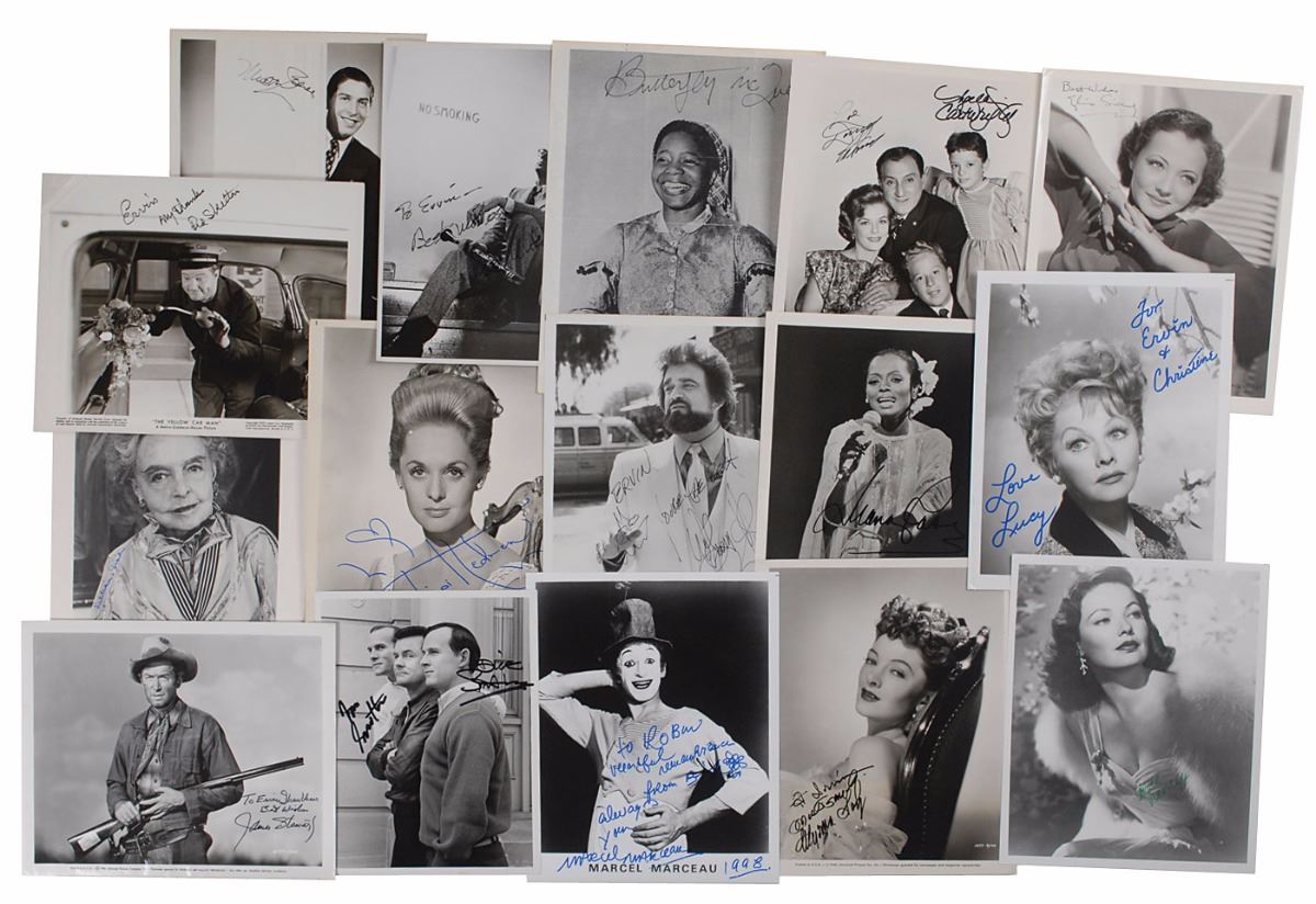 Collection of sixteen photos, all but one glossy, ranging in size from 7 x 9 to 10.25 x 8, each signed in various colored ink and felt tip by the actors or actresses pictured, including: James Stewart (ins); Milton Berle; Lillian Gish; Tippi Hedren; Red Skelton (ins); Steve Allen (ins); Wolfman Jack (ins); Butterfly McQueen (paperstock, with an inscription on the reverse); Danny Thomas and Angela Cartwright; Myrna Loy (ins); Sylvia Sidney; Gene Tierney; Tom and Dick Smothers; Lucille Ball (ins); Diana Ross; and Marcel Marceau. Reverse of several photos bear studio stamps and affixed photo captions. Scattered dings, creases, and soiling, with intersecting folds to the McQueen photo, and a tear to the left edge of the Skelton photo, otherwise overall fine condition.