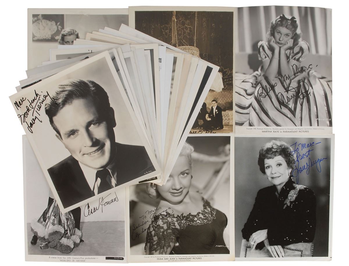 Collection of 31 photos, generally 8 x 10 or 10 x 8, each signed by the actor or actress pictured (several multi-signed), including: Done Ameche and Alice Faye, Lew Ayres and Alice Faye, Henry Brandon and Mary Brian, Cab Calloway (2), Alice Faye, Mitzi Gaynor, Bobe Hope and Jo Ann Greer, Katy Jurado (2), Patric Knowles and Mary Wickes, Evelyn Laye, Gordon ‘Porky’ Lee, Myrna Loy (2), Fred MacMurray and Alice Faye (2), Tony Martin and Alice Faye, George Murphy, Nell O’Day, Luise Rainer, Martha Raye, Paula Raymond and David Bryan, Cesar Romero, Olga San Juan, Ann Sothern (2), Shirley Temple, Lawrence Tierney, Jane Wyman, and Loretta Young. In overall very good to fine condition.