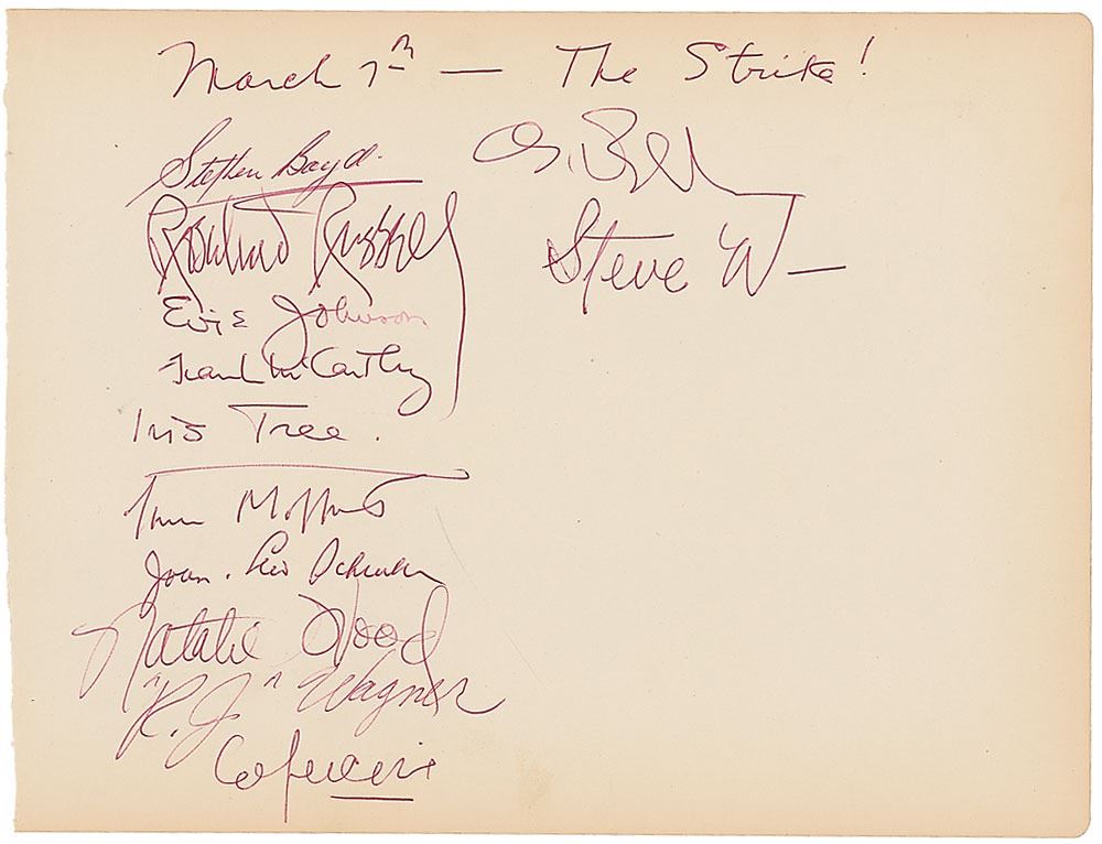 Vintage ballpoint signatures of Stephen Boyd, Rosalind Russell, Evie Johnson, Frank McCarthy, Iris Tree, Natalie Wood, Robert Wagner, Joan and Lew Schreiber, Capucine, and three others on an off-white 12.75 x 9.5 sheet bearing a collector’s notation at the top, “March 7—The Strike!” In fine condition, with mild edge toning. On March 7, 1960, the Screen Actors Guild approved a strike over a dispute about residuals. It lasted six weeks until an agreement was reached, under SAG President Ronald Reagan; however, most members were unhappy with the solution and Reagan resigned from the position in July.