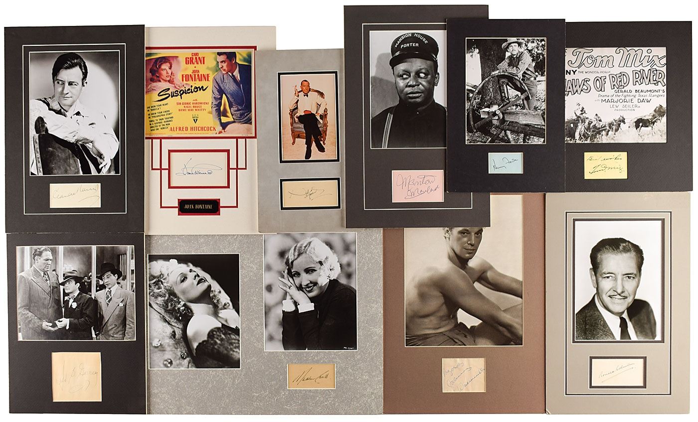 Collection of ten signatures of actors and actresses on slips and cards, individually matted with portraits ranging in size from 8 x 14 to 20 x 16. Includes: Madeleine Carroll, Ronald Coleman, Noel Coward, Leo Gorcey, Henry Fonda, Joan Fontaine, Tom Mix, Mantan Moreland, Claude Rains, and Johnny Weissmuller. In overall fine condition.