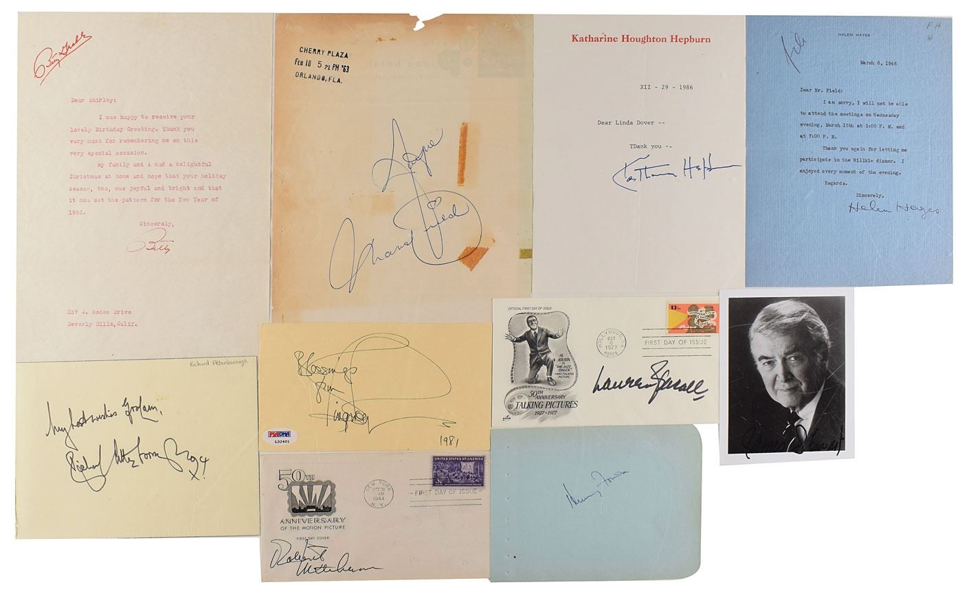 Appealing group lot of 10 items signed in ink or felt tip by a famous actor or actress, including: Richard Attenborough (album page), Lauren Bacall (FDC), Henry Fonda (album page), Betty Grable (TLS), Helen Hayes (TLS), Katharine Hepburn (TLS), Jayne Mansfield (stationery sheet), Robert Mitchum (FDC), Ginger Rogers (card), and James Stewart (SP). In overall very good to fine condition, with toning and tape staining affecting the appearance of the Mansfield signature. Accompanied by a certificate of authenticity from PSA/DNA for the Rogers signature.