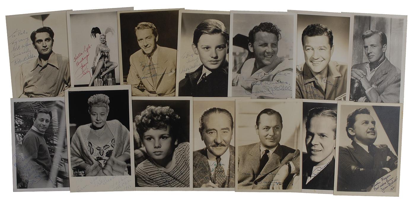 Thirteen vintage 5 x 7 matte-finish photos and one 5 x 8 matte-finish photo, each signed in ink by the respective actor and actress of the 1940s-1960s. Most are inscribed. Signers include: Robert Alda, Bruce Bennett, Bill Bixby, Dan Duyrea, Betty Grable (signed “Betty”), Paul Henreid, Jean Hersholt, Roddy McDowell, Robert Montgomery, Adolphe Menjou, Cameron Mitchell, Dennis Morgan, Dean Stockwell, and Sophie Tucker. In overall very good condition to fine condition.