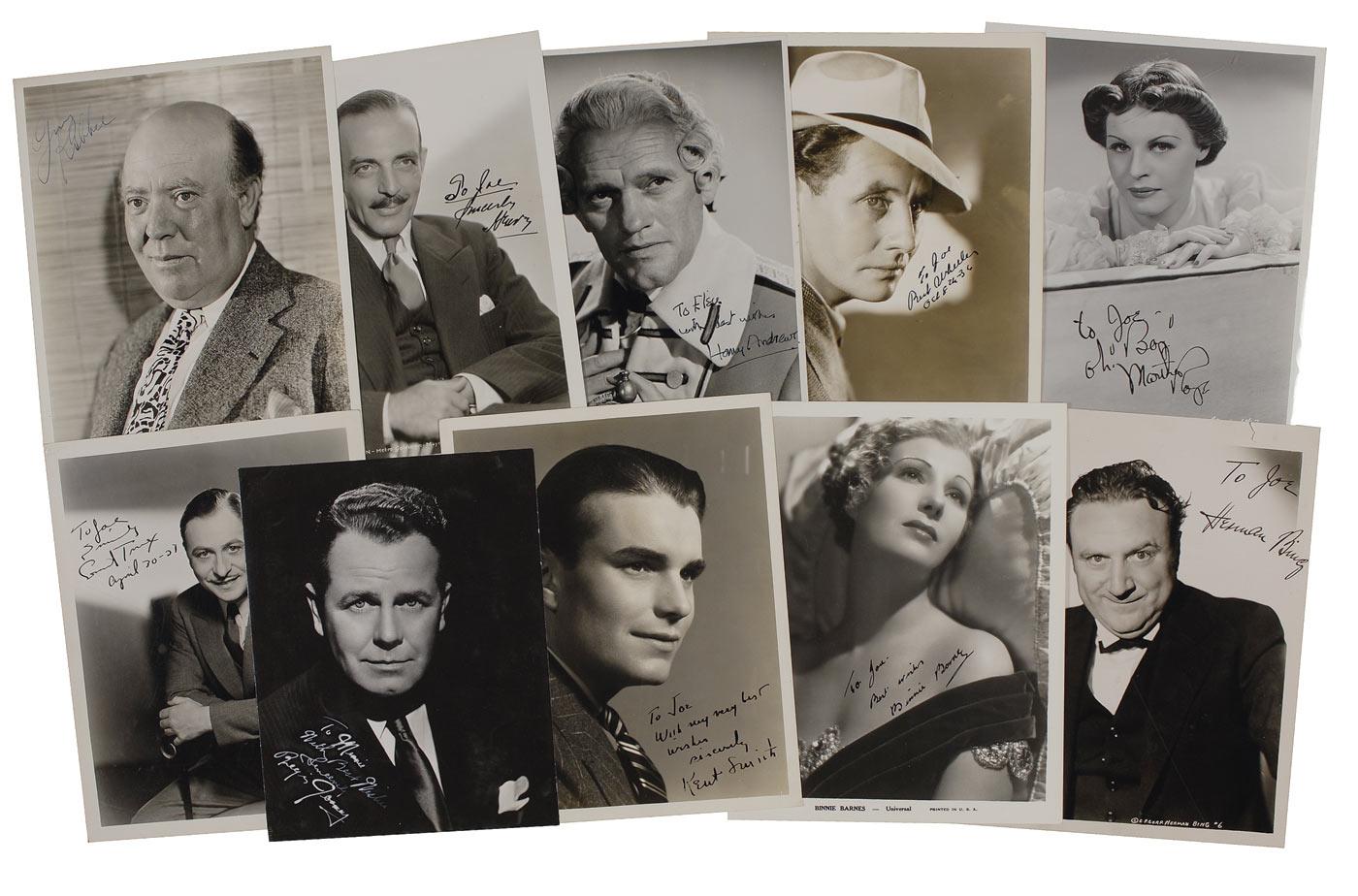 Ten vintage signed glossy and pearl-finish photos, all approximately 8 x 10, each signed and inscribed in ink by the respective actor or actress pictured. Signers are: Harry Andrews, Binnie Barnes, Herman Bing, C. Henry Gordon, Guy Kibbee, Martha Raye, Kent Smith, Regis Toomey, Ernest Truex, and Bert Wheeler. In very good overall condition, with a few trimmed edges, and scattered creases and surface marks.