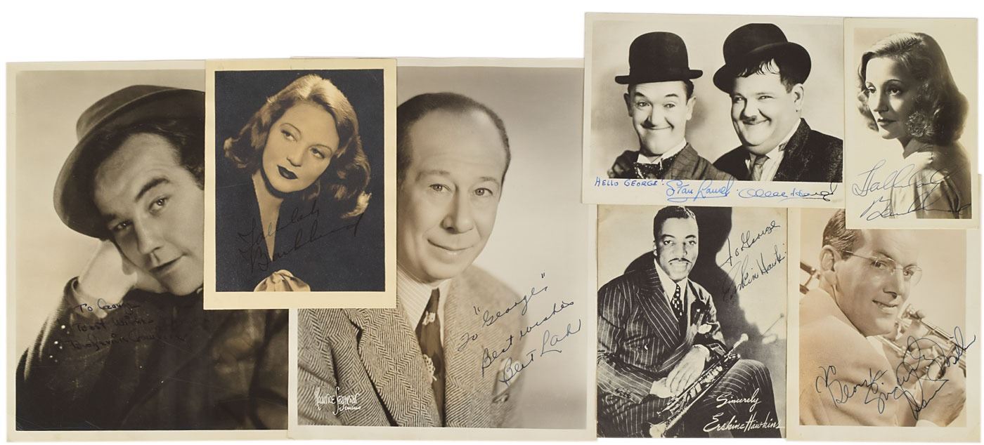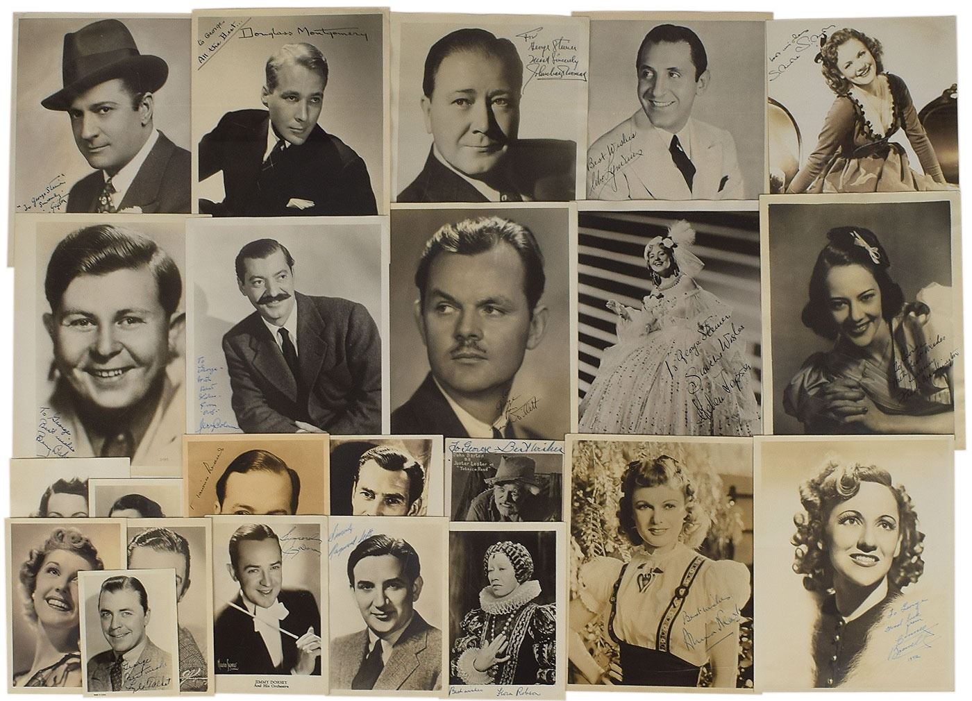 Group of 30 vintage photographs of actors, actresses, and musicians, various finishes, ranging in size from 3.5 x 5.5 to 8 x 10, signed in fountain pen by the subjects (many inscribed). Highlights include: Stan Laurel and Oliver Hardy, Bert Lahr, Broderick Crawford, Tallulah Bankhead (2), Glenn Miller, Erskine Hawkins, Additional signers are: Anita Louise, Benny Baker, John Barton, Connee Boswell, Jerry Colonna, Jimmy Dorsey, Eddy Duchin, Maurice Evans, William Gaxton, Helen Jepson, Abe Lyman, Ethel Merman, Douglas Montgomery, Anna Neagle, Flora Robson (2), Raymond Scott, Simone Simon, James Stephenson, Lyle Talbot, John Charles Thomas, Lawrence Tibbett, and Fredi Washington. In overall very good to fine condition, with Hardy's last name traced over in an unknown hand, creasing to Lahr which touches his face, and occasional creasing to some of the other photos.