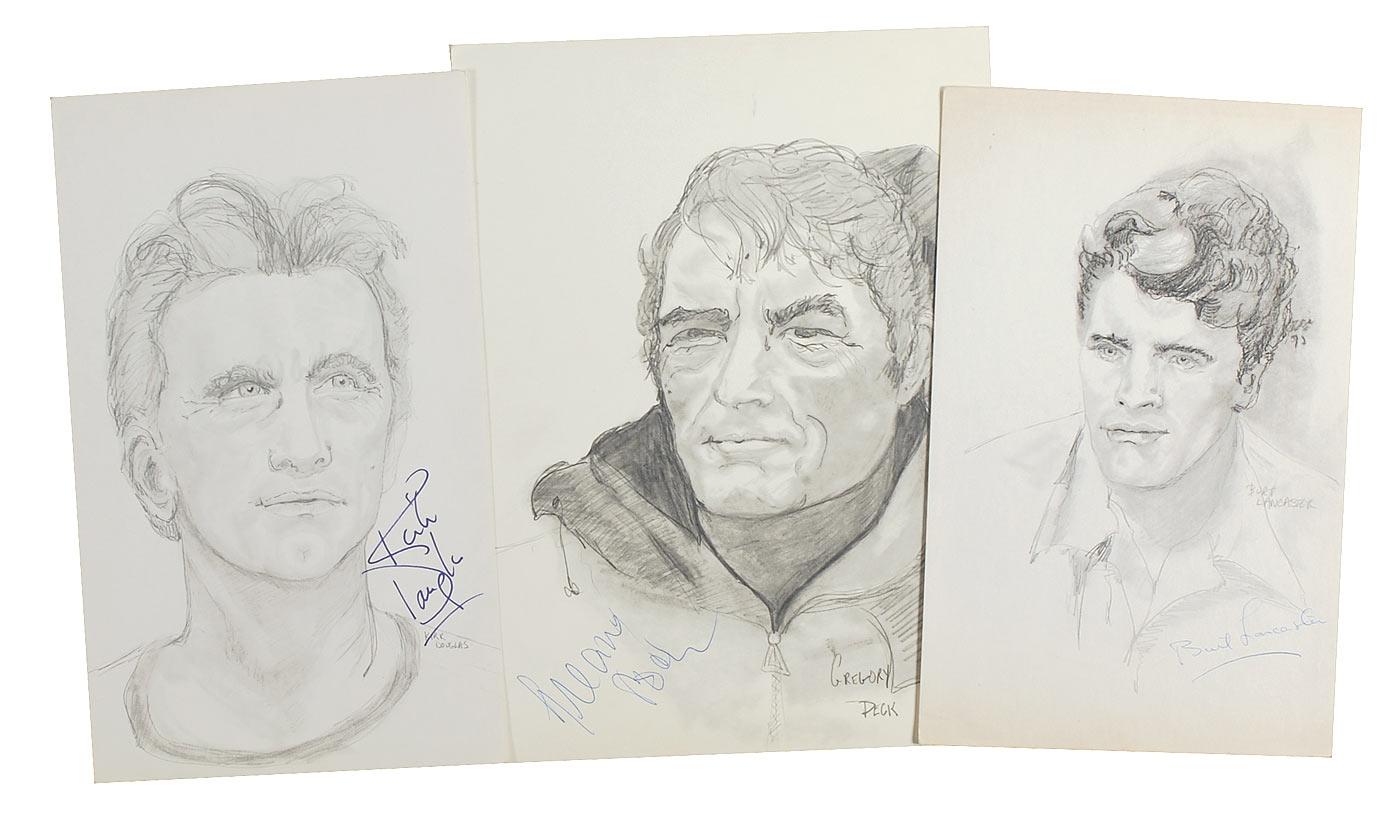 Three original pencil sketches done by a collector, ranging in size from 7 x 10.5 to 9 x 12, each signed in ink by the respective celebrity pictured. Signers are: Kirk Douglas, Burt Lancaster, and Gregory Peck. In fine condition, with light edge toning.