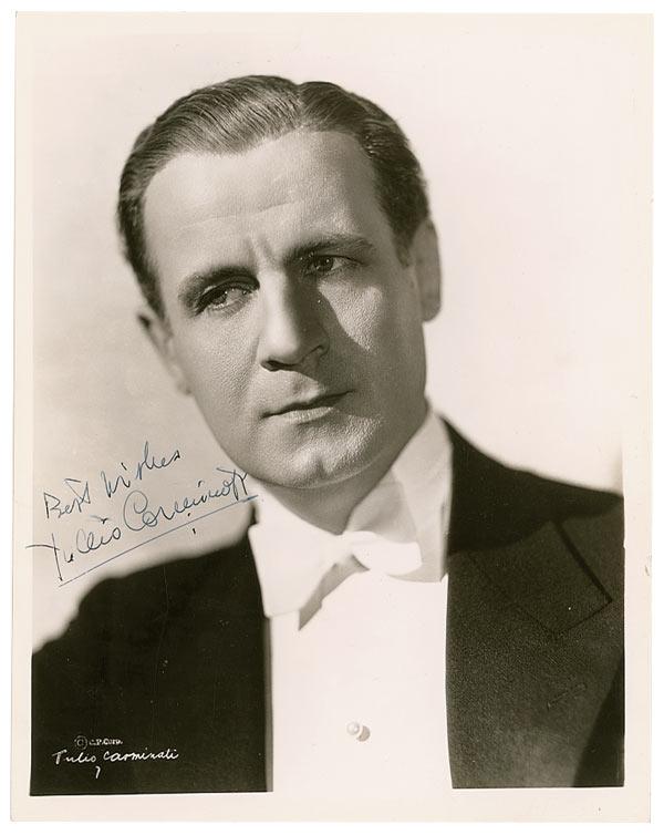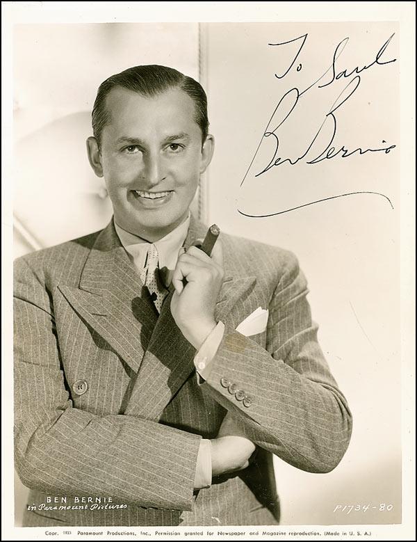 Three vintage glossy 8 x 10 photos: Paramount Pictures 1935 publicity photo of Ben Bernie smiling pleasantly and holding a cigar, signed and inscribed in-person in fountain pen “To Saul, Ben Bernie.” Reverse of photo bears collector’s stamp date of May 26, 1937; photo of Tullio Carminati in a white tie and tuxedo, signed in-person in fountain pen. Reverse of photo bears collector’s ink date notation of September 1934; Radio Pictures full-length photo of Frank Jenks in an overcoat, credited to Bachrach, signed and inscribed in-person in fountain pen “To Saul from Frank Jenks.” Reverse of photo bears collector’s stamp date of August 1937. Each date represents when the signature was acquired. Scattered light creases and surface marks, a few scattered scratches, and some light rubbing to finish, otherwise overall fine condition. Saul Goodman Collection.