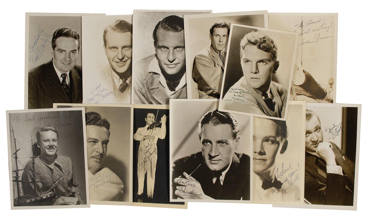 Eleven signed photos of various finishes, ranging in size from 6.5 x 8.5 to 8 x 10, all signed and inscribed in fountain pen in-person by the respective actors pictured. Signers are: Allan Jones, Fred Waring, Kenneth Howell, Ian Hunter, Michael Whalen, Van Johnson, Rubinoff, Harry Ellerbe, Lee Tracy, Ralph Bellamy (2), and John Arledge. In overall fine condition, with a trivial tear to the left edge of Harry Ellerbe’s photo, a vertical fold to the right side of Fred Waring’s photo, ripping to the edges of Van Johnson’s photo, and light surface marks and inconsequential paper loss to the top border of Lee Tracy’s photo. All of the photos, with the exception of John Arledge and Fred Waring, bear either an inked or stamped date from the collector on the reverse, noting the date the signature was acquired. In fine condition. Saul Goodman Collection.