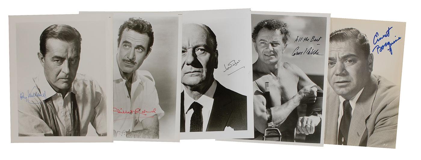 Five signed glossy photos, four 8 x 10 and one 7.25 x 9.25, all signed in felt tip by the respective actors, including Cornel Wilde, Ray Milland, John Gielgud, Gilbert Roland, and Ernest Borgnine. In fine condition, with scattered surface creasing, a small tear to the right border on Milland’s photo, and a few dings to the right border on Wilde’s photo.