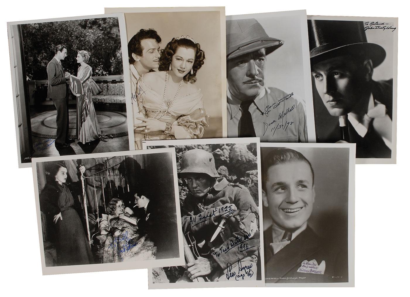 Seven glossy photos, six 8 x 10 and one 10 x 8, each signed in ink or felt tip by the respective actors pictured. Signers are: John Dusty King (ins), Jack LaRue (ins), David Manners (ins), William Bakewell (ins), Jack Mulhall (ins), Lew Ayers (ins), and Douglas Fairbanks, Jr. Mild creasing and toning, some light surface marks, and slight contrast to David Manners and Jack LaRue’s signatures, otherwise fine condition.