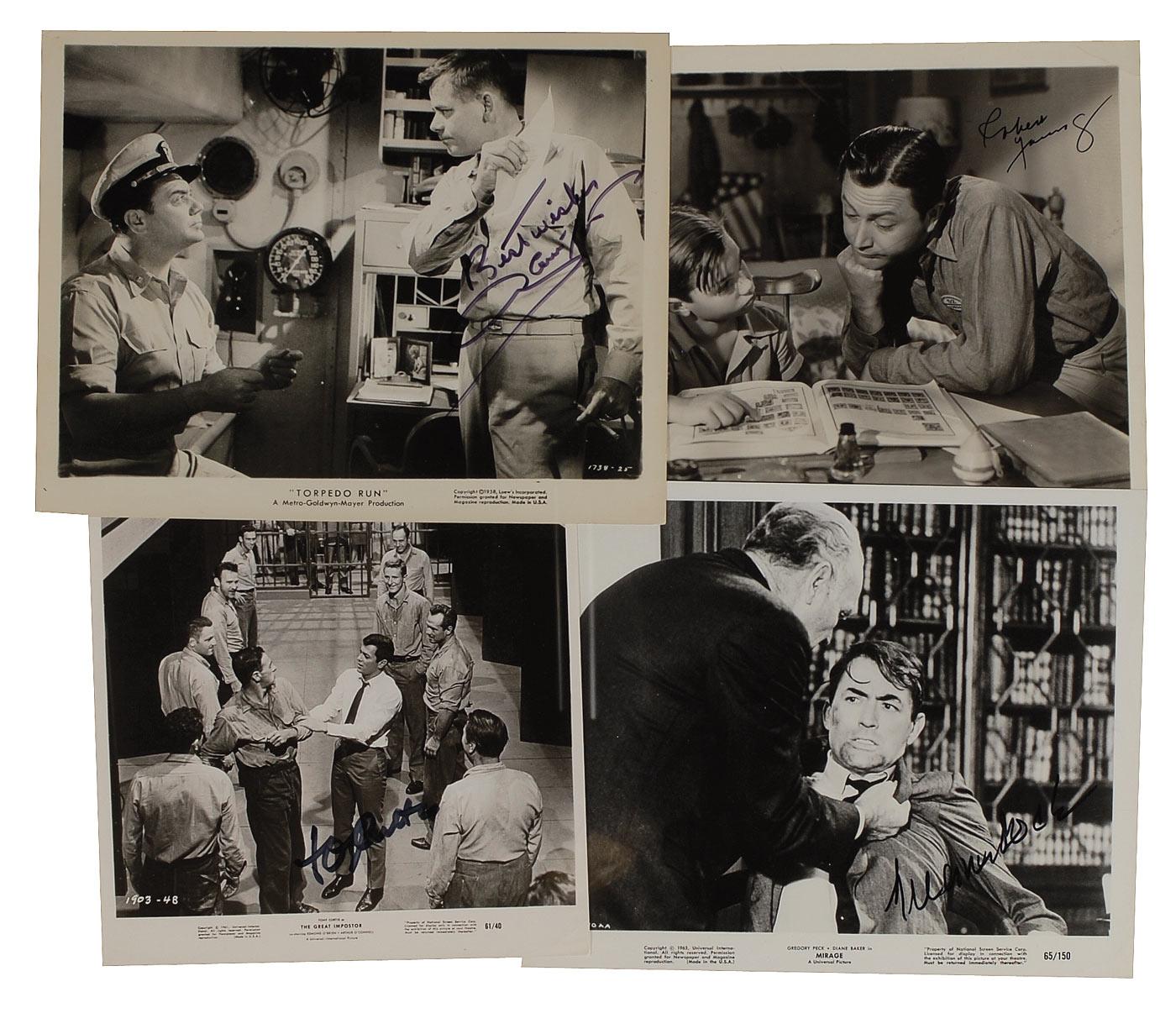 Four glossy photos, one 8 x 10 and three 10 x 8 promotional Universal Pictures and Metro-Goldwyn-Mayer Pictures photos, each signed in ink by the respective actors pictured. Signers are: Tony Curtis (The Great Imposter), Gregory Peck (Mirage), Robert Young (Joe Smith, American), and Glenn Ford (Torpedo Run). Light creasing and mild surface impressions, and slight contrast to Tony Curtis and Gregory Peck’s signatures, otherwise fine condition.