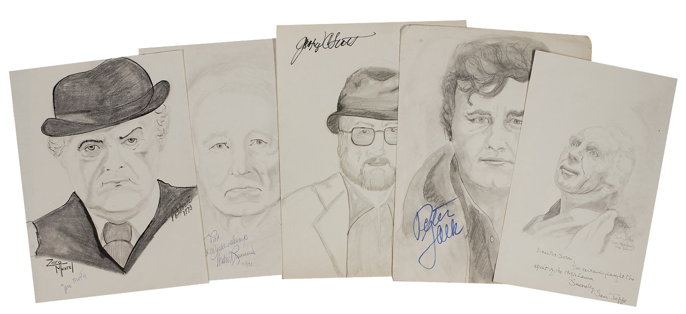 Four original ink and pencil sketches, all done by an admirer, ranging in size from 7 x 11 to 9 x 12, each signed in ink or felt tip by the respective actor pictured. Signers are: Sam Jaffe (ins), Zero Mostel, Walter Brennan (ins), Peter Falk, and George C. Scott. In fine overall condition, with faint toning and light creasing, and heavier areas of toning and a few small tears to Falk’s sketch.