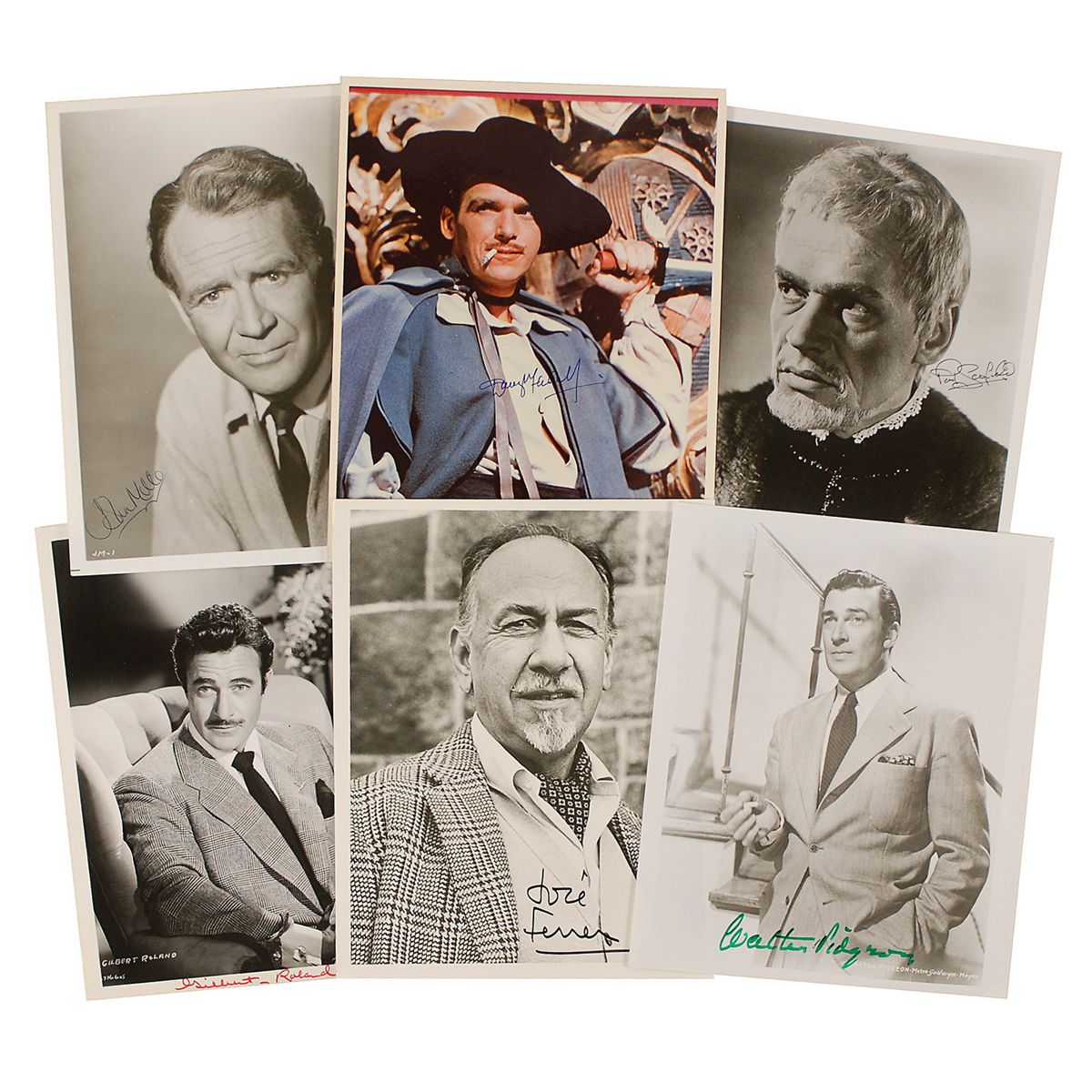 Six glossy 8 x 10 photos, one color, each signed in ballpoint or felt tip by the respective actor pictured. Signers are: John Mills, Douglas Fairbanks Jr., Gilbert Roland, Walter Pidgeon, Jose Ferrer, and Paul Scofield. In fine condition.