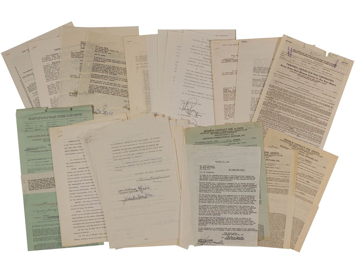 Collection of 13 documents, most multi-page, each signed by a different actor. Signers are: David O. Selznick, Aaron Spelling, Fess Parker, Robert Stack, Jack Cooper, Milton Berle, Jackie Oakie, Keefe Brasselle, Charlie Ruggles, Rory Calhoun, Cedric Hardwicke, Cesar Romero, and Mickey Rooney. In overall very good condition.
