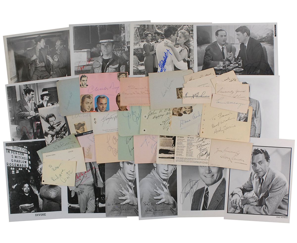 Collection of 44 items, consisting of signed photos and signatures, with some of the items inscribed. Signers are: Dana Andrews, Noah Beery (2), Charles Boyer, Joe E. Brown, Francis X. Bushman, Richard Conte, Richard Crenna, Andy Devine, Divine, Kirk Douglas, Peter Fonda, Samuel Goldwyn, Larry Hagman, Monte Hale, William S. Hart, Paul Henreid, John Ireland, Emmett Kelly, Alan Ladd, Harry Lauder (2), Tom Laughlin, Peter Lorre, Louis B. Mayer, George Melville, Dudley Moore, Pat O’Brien, Anthony Perkins (2), Dick Powell (2), Vincent Price, George Raft, Cesar Romero, Mickey Rooney, Randolph Scott, Antonio Scotti, Oscar Shaw, Johnny Sheffield, Arthur Train, Eli Wallach, David Warfield, and Efrem Zimbalist, Jr. and Rhonda Fleming. In overall very good condition.