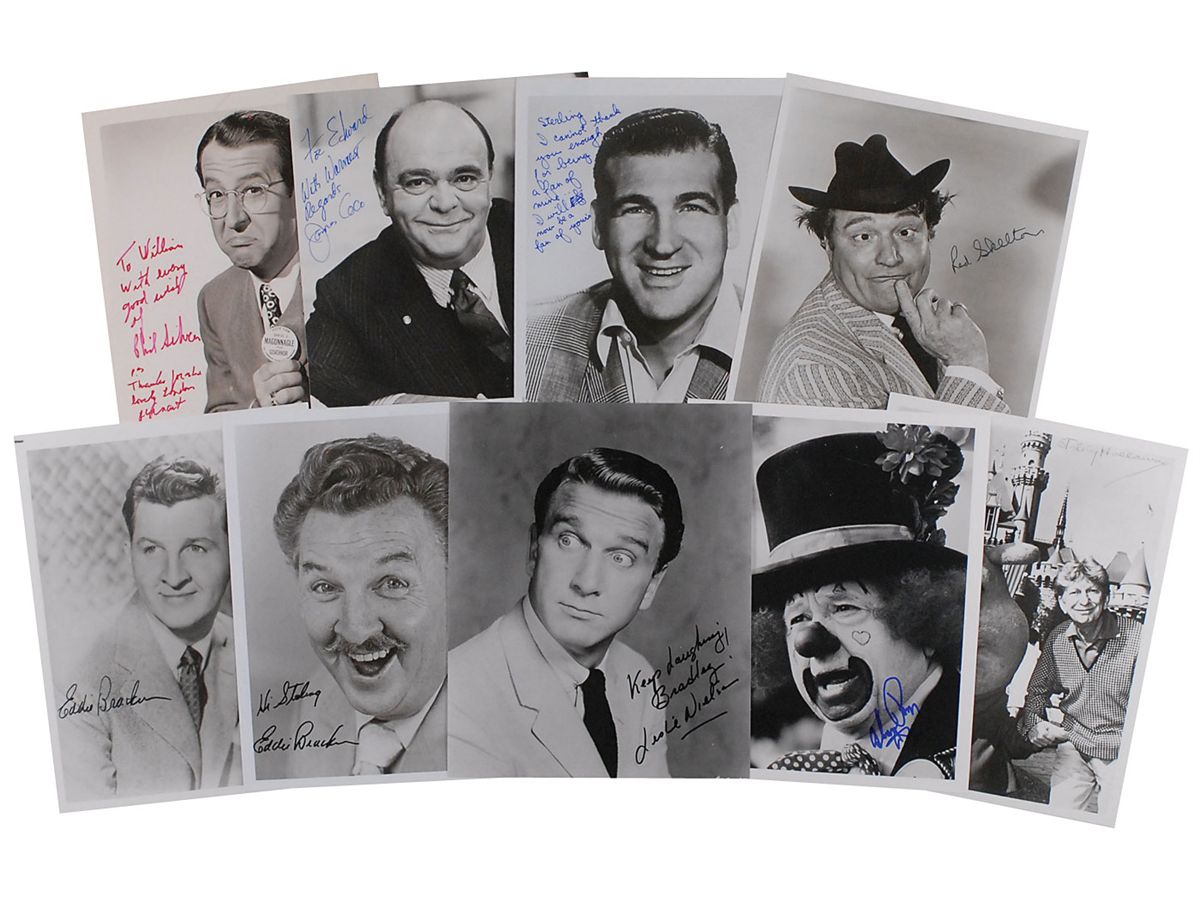 Group of nine 8 x 10 photos, various finishes, each signed in ink or felt tip by the actor pictured, with some adding inscriptions. Signers are: Eddie Bracken (2), James Coco, Shecky Greene, Sterling Holloway, Leslie Nielsen, Mickey Rooney, Phil Silvers, and Red Skelton. In fine condition.