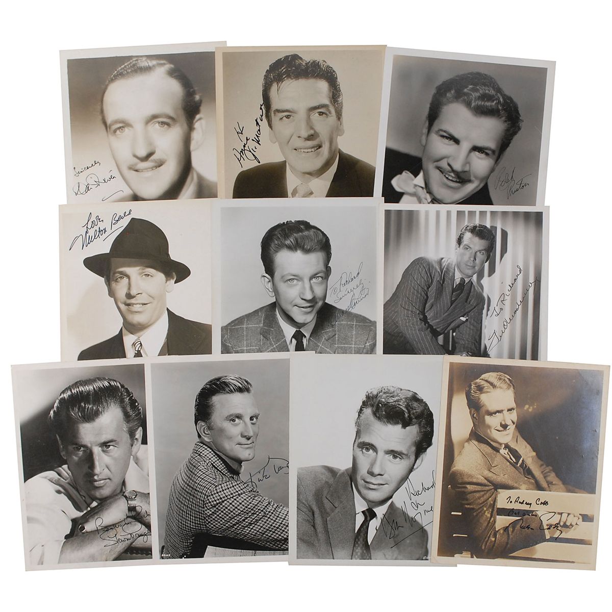 Collection of 10 photos, all approximately 8 x 10, various finishes, each signed in ink or felt tip by the actor pictured. Signers are: Donald O’Connor (ins), Robert Preston, David Niven, Victor Mature, Fred MacMurray (ins), Nelson Eddy (ins), Stewart Granger (ins), Kirk Douglas, Milton Berle, and Dirk Bogarde. In overall very good condition.