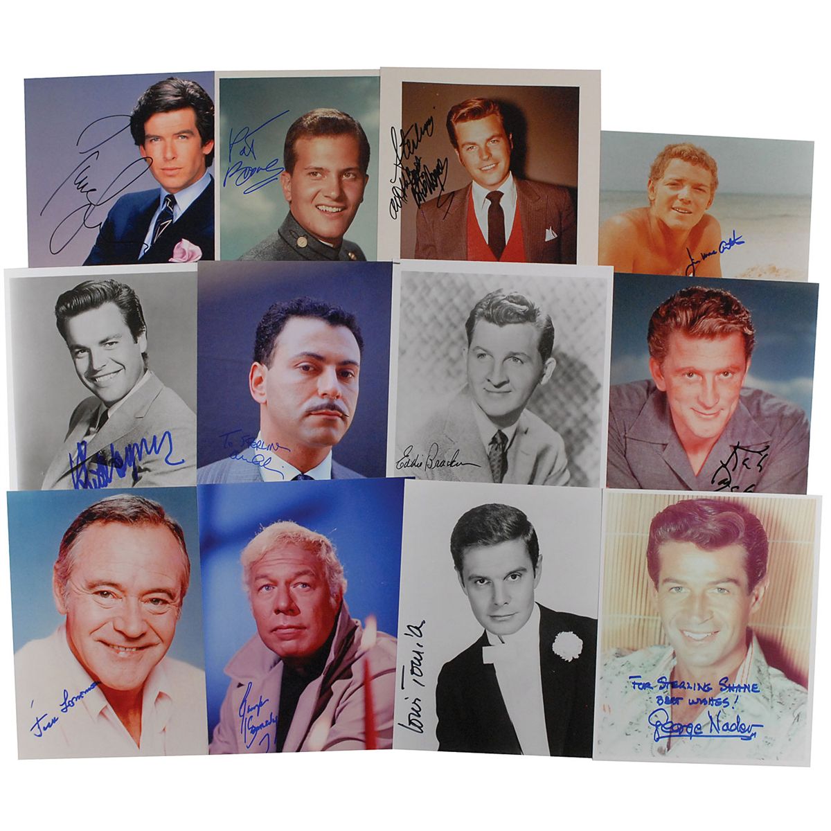 Collection of 12 glossy photos, 8 x 10 and 10 x 8, each signed in ink or felt tip by the actor pictured. Signers are: Alan Arkin (ins), Pat Boone, Eddie Bracken, Pierce Brosnan, Kirk Douglas, Louis Jourdan, George Kennedy, Jack Lemmon, James MacArthur, George Nader (ins), and Robert Wagner (2, 1 ins). In fine condition.