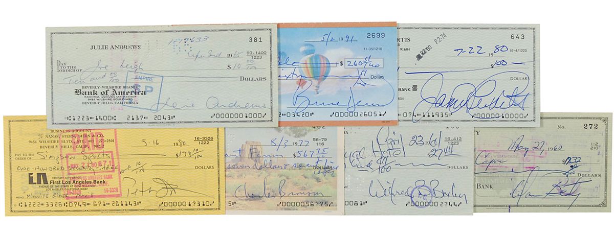 Collection of seven personal checks, each signed by a different actor or actress. Signers are: Peter Fonda, Bruce Dern, Jamie Lee Curtis, Charles Bronson, Bill Bixby, Warren Beaty, and Julie Andrews. In fine condition, with expected bank stamps and cancellation holes.