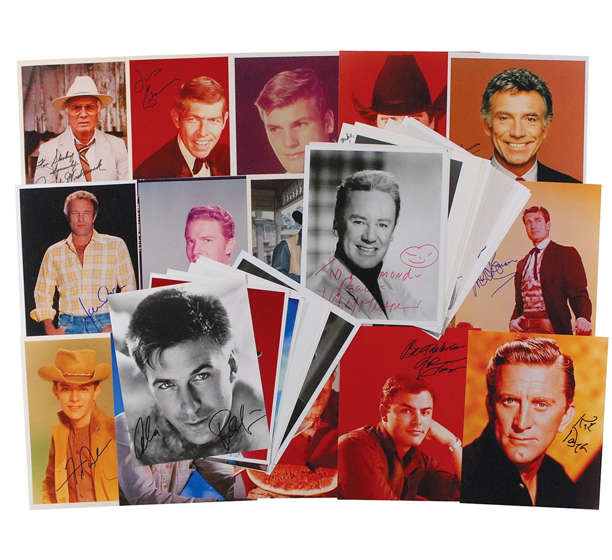 Collection of 36 photos, 18 in color, all 8 x 10, each signed in ink by the actor pictured, including: Richard Widmark (inscribed), James Coburn, Tab Hunter (inscribed), John Travolta (inscribed), Tony Franciosa, James Caan, Steve Forrest (inscribed), George Montgomery (2, both inscribed), Hugh O’Brien, Frankie Avalon, Jack Elam, Don Murray (2, one inscribed), Fess Parker, Richard Benjamin, John Saxon, Kirk Douglas, Van Johnson (inscribed), Herbert Lom, David Dukes (inscribed), Robert Culp, Eddie Bracken, Sterling Holloway, Eddie Bracken (inscribed), Ron Ely (2), Donald O’Connor, Victor Mature (inscribed), Hal Williams (inscribed), Richard Crenna (inscribed), Gordon MacRae (inscribed), Steve Reeves, Ryan O’Neal, Ned Beatty, and Alec Baldwin. In overall fine condition.