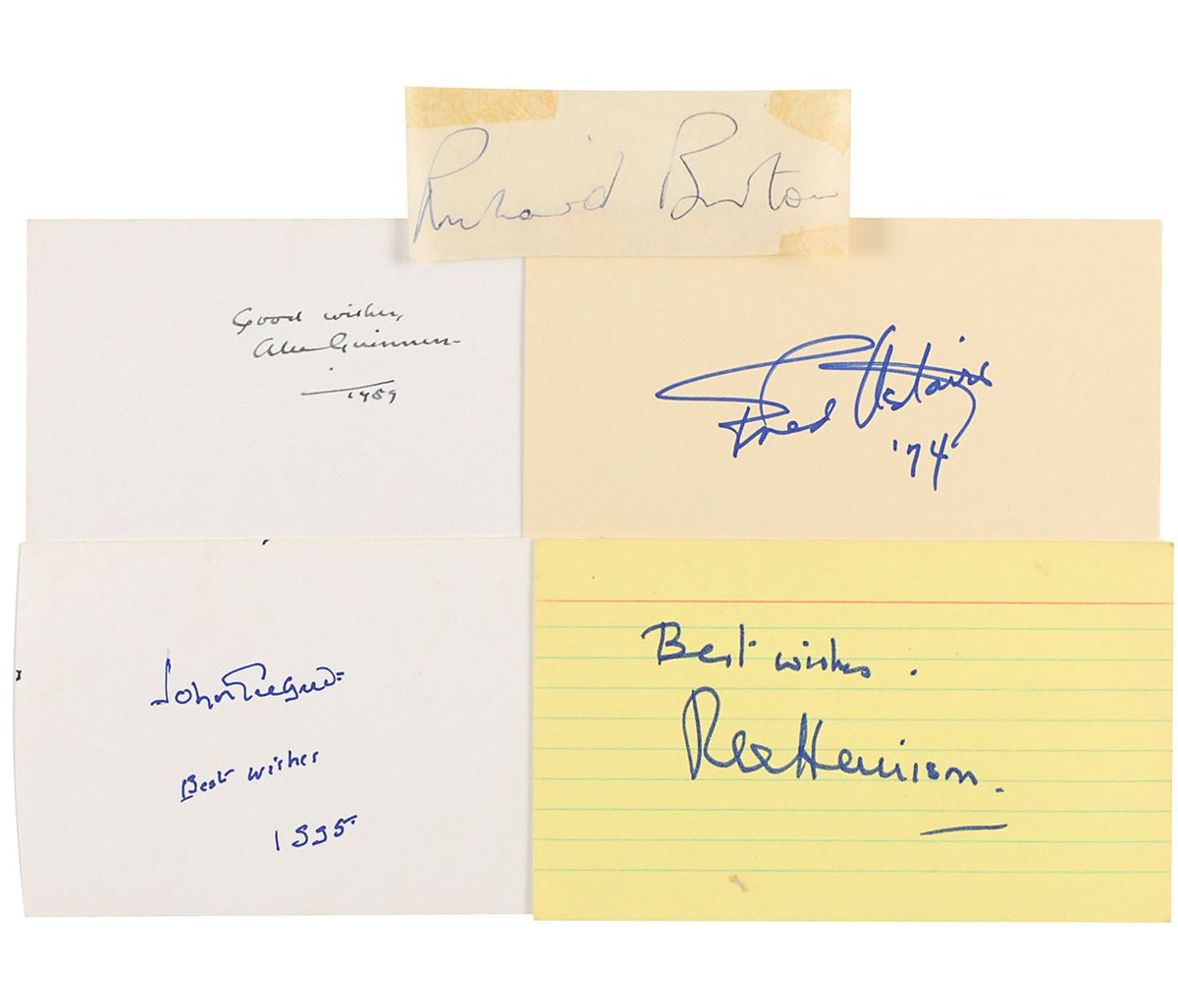 Five felt tip and ballpoint signatures of actors on individual slips and cards, including: Rex Harrison, John Gielgud, Richard Burton, Alec Guinness, and Fred Astaire. Toned adhesive remnants to corners of the Burton slip, otherwise overall fine condition.