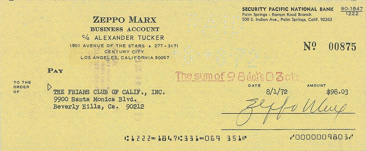 Collection of four checks, each signed by an actor, including: George Burns, Francis X. Bushman, Harold Russell, and Zeppo Marx. In overall fine condition.
