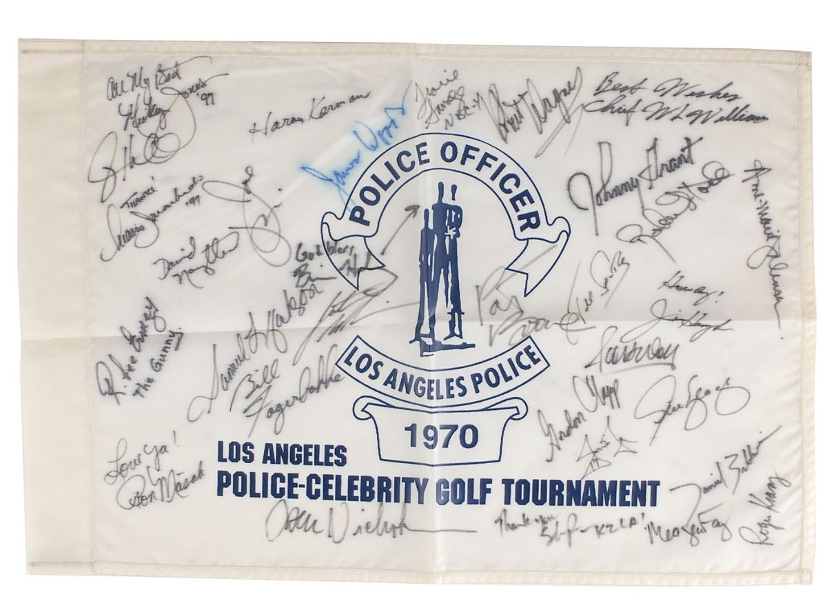 White golf flag from the 1997 Los Angeles Police-Celebrity Golf Tournament, 20.5 x 14, signed in black felt tip by over 30 participants, including: Jack Nicholson, Joe Pesci, Samuel L. Jackson, James Woods, Pat Boone, R. Lee Ermey, Robert Wagner, Harvey Korman, Mickey Jones, Robert Stack, John Beard, Ann Marie Johnson, Gordon Clapp, Ron Masak, Steve Yeager, Shawn Parr, David Naughton, Tracy Savage, James Hampton, Joe Santos, Scott Wolf, Jim Fox, Daniel Baldwin, Meagen Fay, Roger Kranz, Brian Haley, Bill Fagerbakke, Jim Hill, and Chief Willie L. Williams. In fine condition, with some scattered soiling and a bit of spreading to some signatures. Accompanied by a program from the event.
