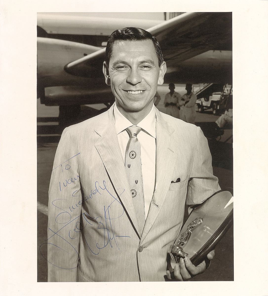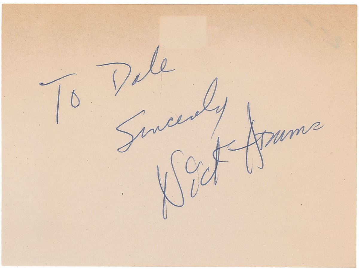 Three items: a vintage ballpoint signature, “To Dale, Sincerely, Nick Adams,” on an off-white 4.75 x 3.5 sheet; a vintage matte-finish 11 x 12.25 half-length photo of Jack Webb holding an award, signed and inscribed in blue ballpoint, “To Ivan, Sincerely, Jack Webb”; and an early vintage matte-finish 10.5 x 13.5 photo of Rick Jason seated with a book and cigarette, signed and inscribed in blue ballpoint, “To Estelle—with especially nice wishes for an especially nice person—always, Rick Jason.” In overall fine condition.