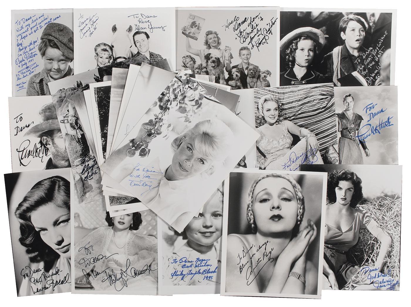 Twenty-six glossy mostly 8 x 10 photos, each signed and inscribed (mostly to “Dana”) by the respective Hollywood star pictured. Signers are: Doris Day, Julie Newmar, Clayton Moore, Anita Page (2), Bobs Watson, Delmar Watson, Alan Young/Connie Hines, Margaret O’Brien, Jane Russell, Penny Singleton, Don Knotts, Kathryn Grayson, Charlton Heston (2), Alice Faye, Kirk Douglas, Adriana Caselotti, Lauren Bacall, Hedy Lamarr, Shirley Temple Black, James Stewart, Milton Berle, Brigitte Bardot, Robert Shayne (purportedly the last autograph he signed), and Gregory Peck. In overall fine condition.
