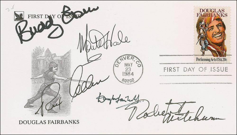 FDC, 6.5 x 3.75, with a cachet honoring Douglas Fairbanks, signed on the front in black ink by Douglas Fairbanks, Jr., Buddy Ebsen, Robert Mitchum, Rex Allen, and Monte Hale. In fine condition.