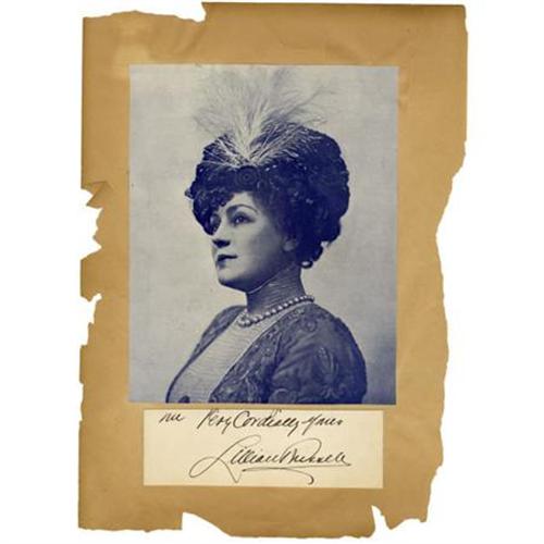 <B>Actress Lillian Russell Signature</B></I> “<I>Very Cordially Yours Lillian Russell</B></I>”. 6” x 2”, mounted with a photograph clipped from a magazine all of which are mounted to an old album page. This is a big, bold and beautiful signature by possibly the most popular American actress and singer of the late nineteenth and early twentieth century. The old album page is significantly chipped with age but the signature is in fine condition. <BR><BR><b>Shipping:</b> Flat Material, Small (<a target="_blank" href="http://www.heritageauctions.com/common/shipping.php">view shipping information</a>)