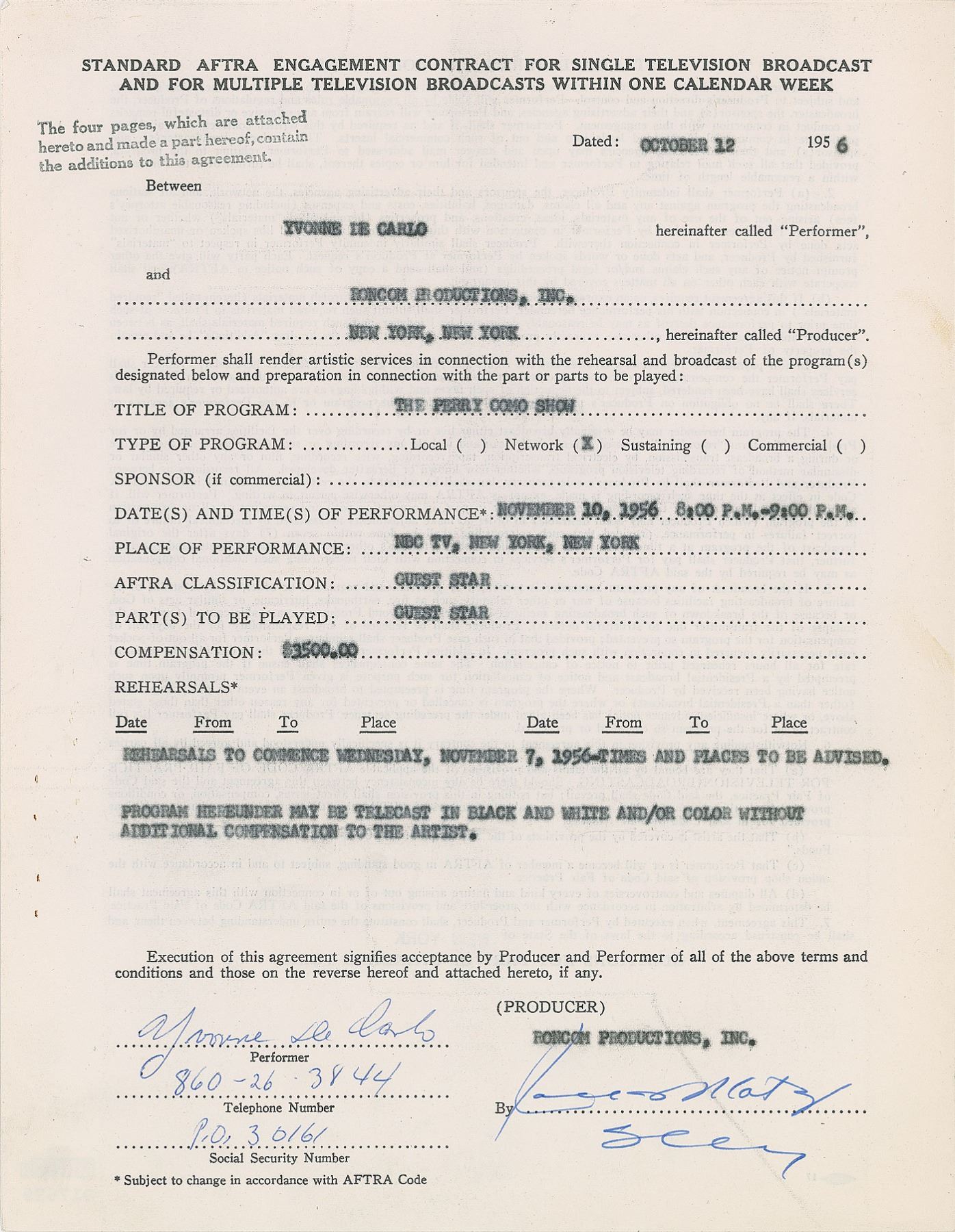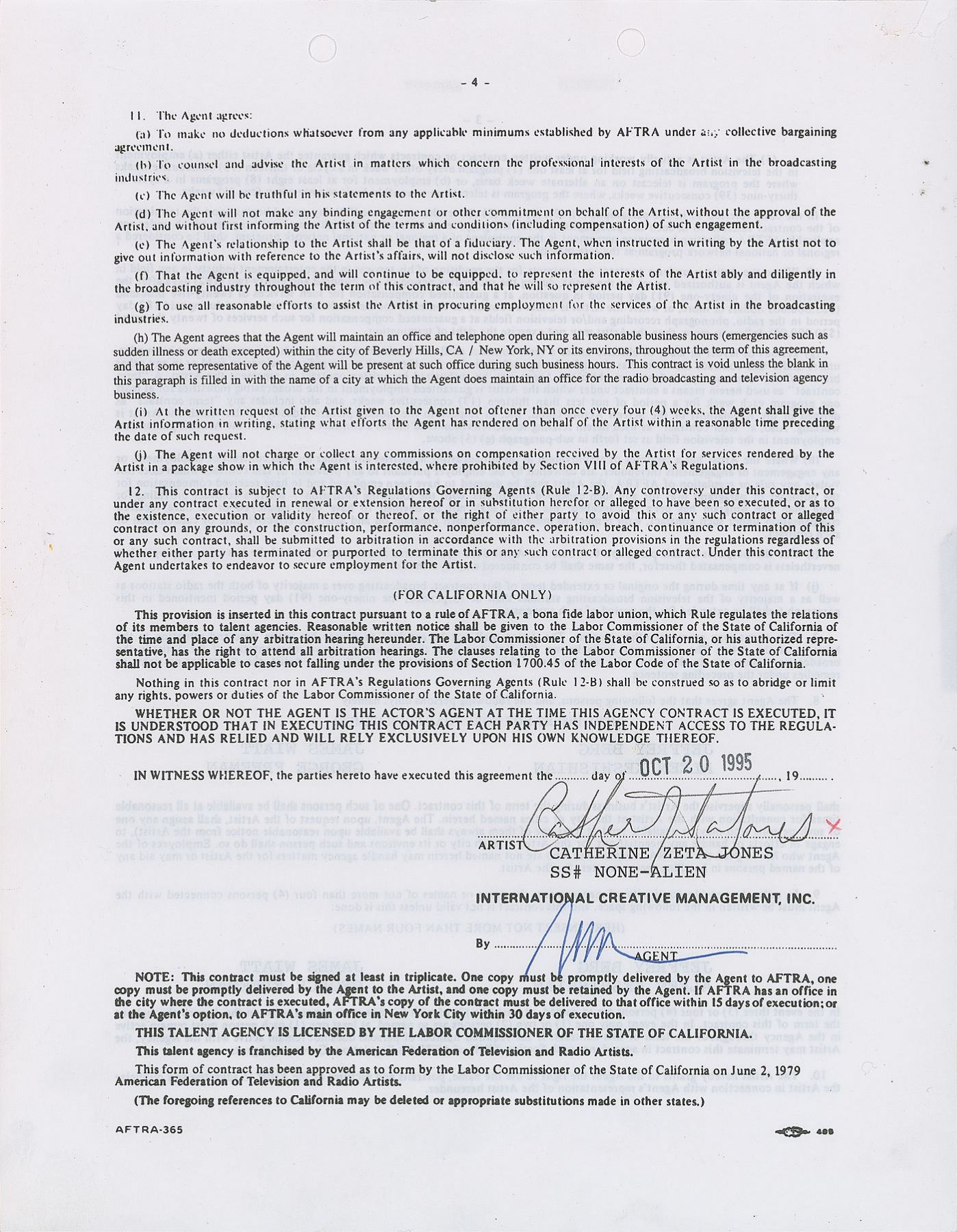 Group of three contracts signed by actresses, including: the last page of a 1995 agency contract signed by Catherine Zeta-Jones; a 1997 Patina Catering document signed by Sigourney Weaver; and a 1956 AFTRA agreement signed by Yvonne De Carlo. In overall fine condition, with a PSA/DNA label affixed to the reverse of the De Carlo document (certificate of authenticity not present), and a JSA label affixed to the Weaver document. Accompanied by a certificate of authenticity from JSA for the Weaver document.