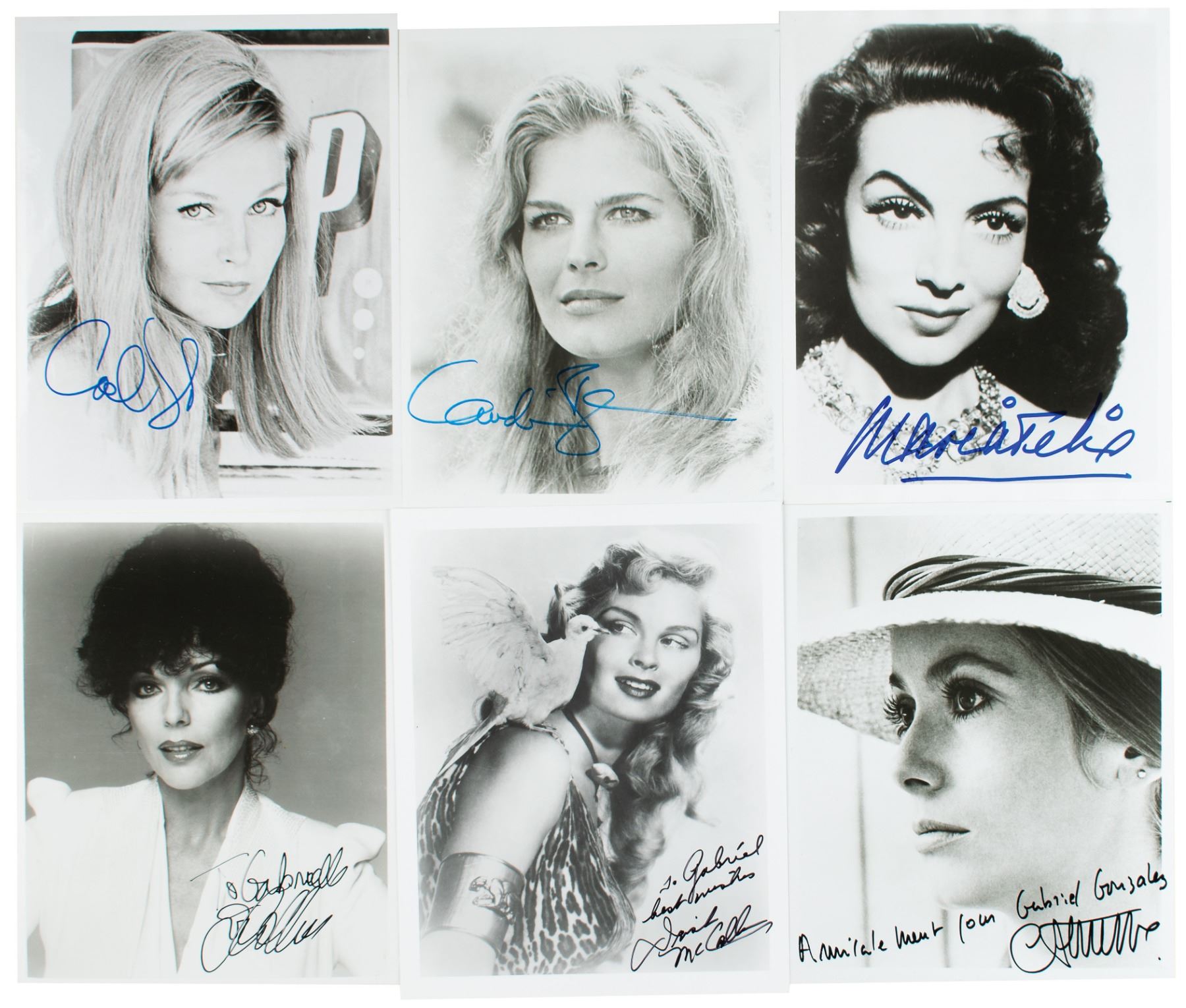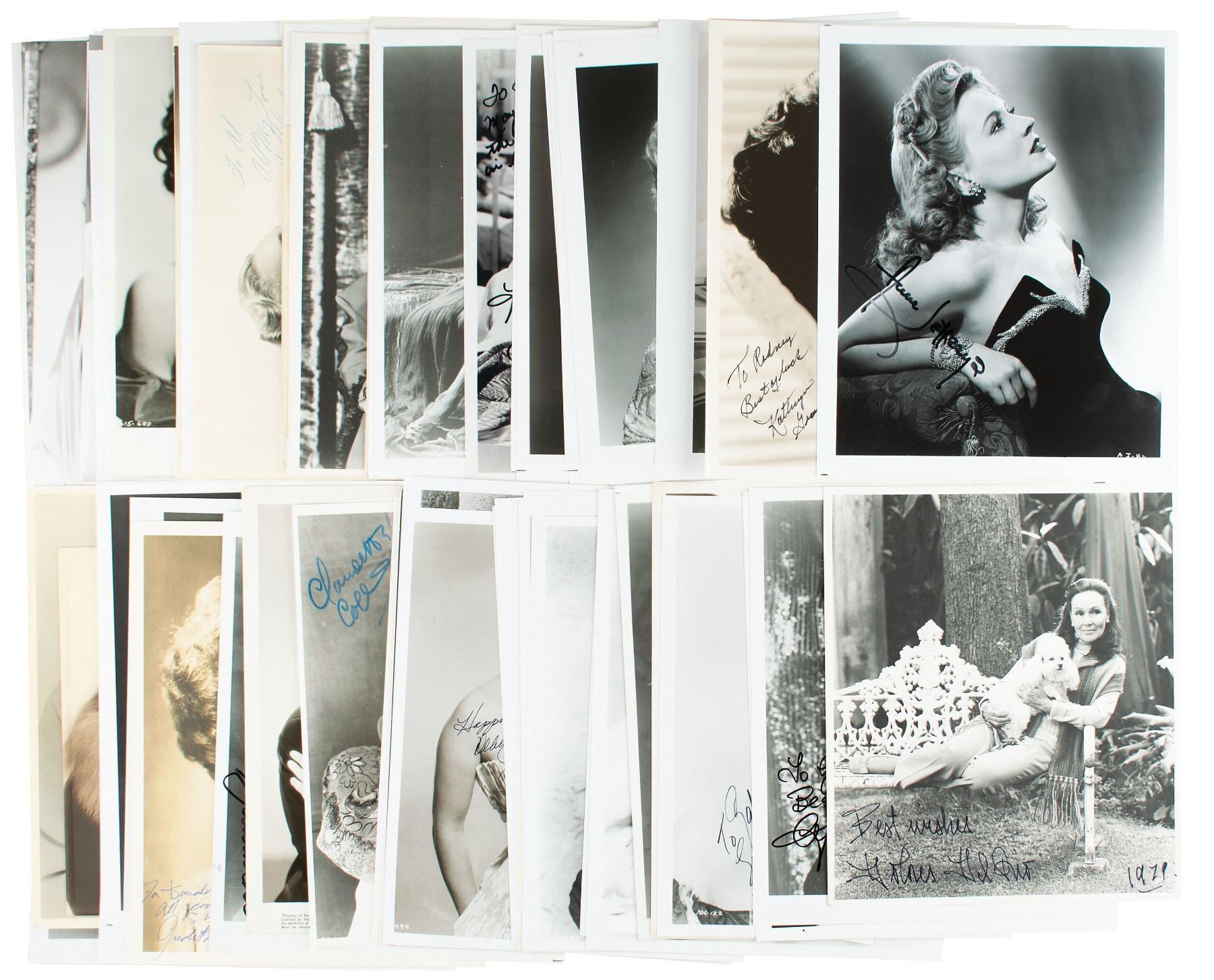Collection of 133 photos signed in ink or felt tip by an acclaimed actress, most 8 x 10 or 10 x 8, with many inscribed, including: Judith Anderson (2), Ann-Margret, Lauren Bacall (3), Brigitte Bardot, Kim Basinger, Candice Bergen, Senta Berger, Jacqueline Bisset (2), Linda Blair, Carol Burnett, Madeleine Carroll, Adriana Caselotti (3), Stockard Channing, Cyd Charisse (3), Julie Christie, Mae Clarke, Glenn Close (2), Claudette Colbert, Joan Collins, Virginia Dale, Judy Davis, Doris Day, Laraine Day, Yvonne De Carlo (2), Dolores del Río, Catherine Deneuve, Angie Dickinson, Marlene Dietrich (3), Frances Drake, Irene Dunne, Mia Farrow, Alice Faye, María Félix, Rhonda Fleming (2), Lillian Gish (2), Paulette Goddard, Kathryn Grayson, Karolyn Grimes, Margaret Hamilton, June Haver, Tippi Hedren (2), Celeste Holm (2), Marsha Hunt, Betty Hutton (2), Anne Jeffreys, Dorothy Jordan, Janet Leigh (2), Ruby Keeler, Jean Kent, Deborah Kerr (2), Elyse Knox, Dorothy Lamour, Angela Lansbury (3), Gina Lollobrigida, Sophia Loren, Myrna Loy (2), Ida Lupino, Carol Lynley, Mary Martin, Marilyn Maxwell, Virginia Mayo (2), Irish McCalla, Dorothy McGuire, Ethel Merman, Julie Newmar (4), Gertrude Niesen, Maureen O'Hara, Maureen O'Sullivan, Eleanor Parker, Michelle Pfeiffer, Eleanor Powell, Lee Remick, Debbie Reynolds (3), Flora Robson, Ginger Rogers (2), Diana Ross, Gena Rowlands, Susan Sarandon, Brooke Shields, Dinah Shore, Jean Simmons, Maggie Smith, Gale Sondergaard, Barbara Stanwyck (2), Gloria Swanson, Shirley Temple, Phyllis Thaxter, Lily Tomlin, Claire Trevor, Kathleen Turner (2), Lana Turner (2), Esther Williams, Marie Wilson, Debra Winger (2), Jane Wyatt, Sean Young, Susannah York, and three photos signed by Wizard of Oz actresses Betty Tanner, Fern Formica, and Margaret Pellegrini. In overall fine condition.