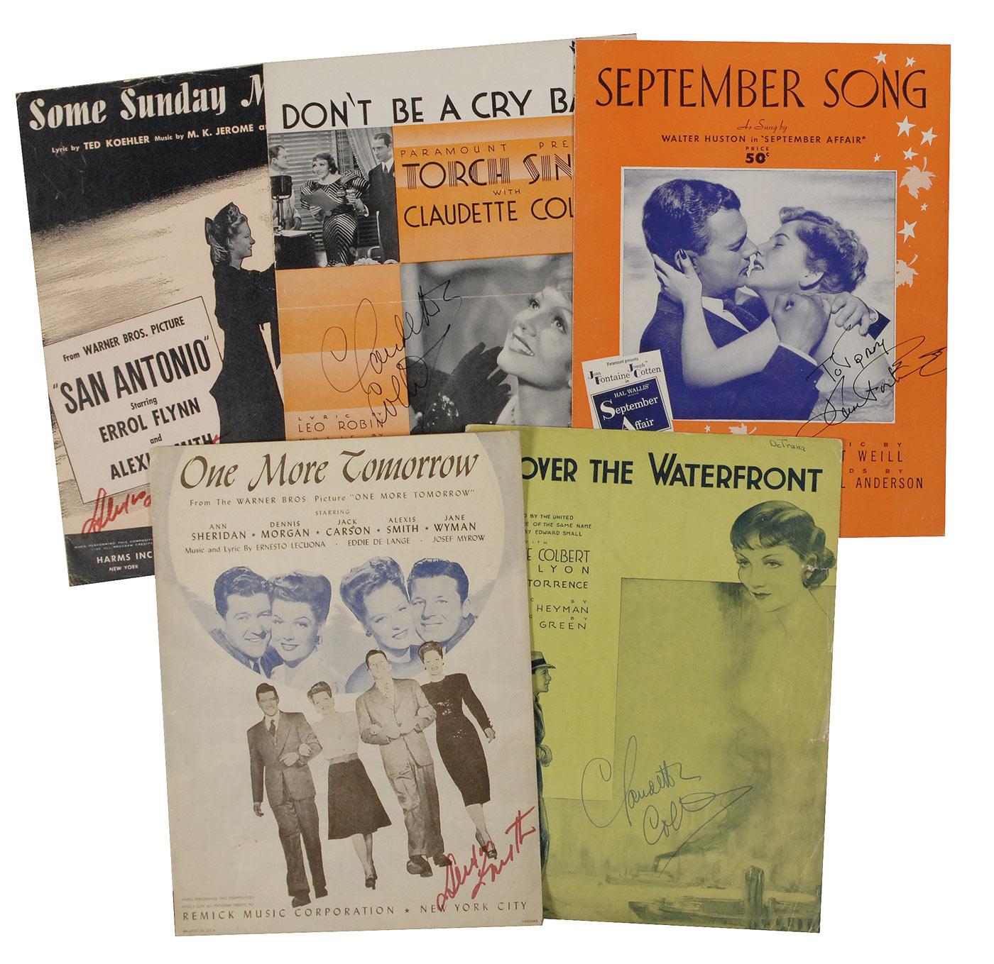Five pieces of sheet music from various films, each signed on the cover in felt tip by an actress from the film. Signers are: Claudette Colbert (‘I Cover the Waterfront’ and ‘Don’t Be a Cry Baby’), Alexis Smith (‘Some Sunday Morning’ and ‘One More Tomorrow’), and Joan Fontaine (ins) (‘September Song’). In very good overall condition.