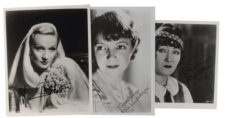 Three glossy photos, two 8 x 10 and one 10 x 8, each signed in felt tip by the respective actress pictured. Signers are: Marlene Dietrich, Helen Hayes, and Greer Garson. In fine condition, with scattered creases and surface impressions to Garson’s photo.