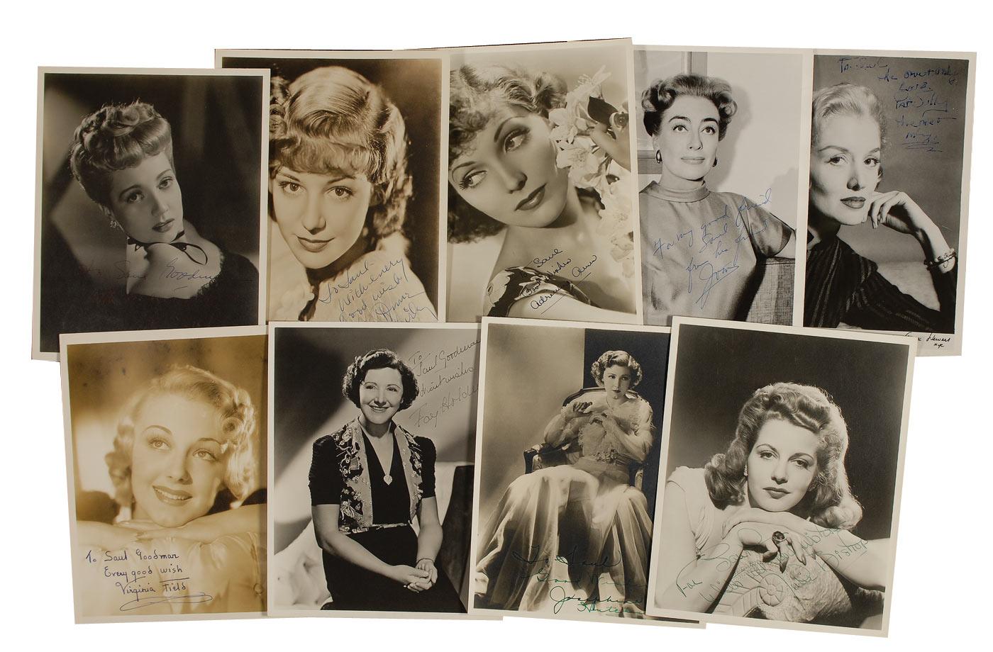 Nine vintage glossy and matte-finish 8 x 10 photos, all signed and inscribed in fountain pen and ink in-person by the respective actresses, including: Ann Sothern, Joan [Crawford], Adrienne Ames, Julie Bishop, Virginia Field, Fay Holden, Josephine Hutchinson, Pat Sully, and Anne Shirley. In overall fine condition, with heavy contrast to Sothern’s signature, scattered toning to the top of Virginia Field’s photo, light silvering to the darker areas of Hutchinson’s photo, and rippling to the edges of Sully’s photo and irregular ink adhesion to the signature. All of the photos, with the exception of Pat Sully’s, bear either an inked or stamped date from the collector on reverse, showing when the signature was acquired. Saul Goodman Collection.