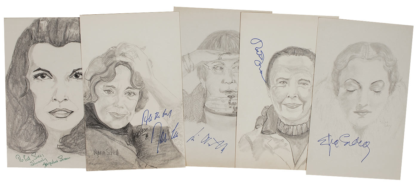 Five original pencil sketches, all done by an admirer, ranging in size from 7 x 11 to 8 x 10.5, each signed in felt tip by the respective actress pictured. Signers are: Maria Schell, Lina Wertmuller, Sylvia Sydney, Ruth Gordon, and Jacqueline Susann (ins). Sketches also bear artist’s name and the year drawn. In fine overall condition, with faint toning and some light corner creasing.