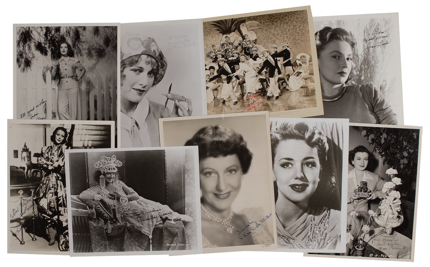 Nine glossy photos, 8 x 10 or 10 x 8, of various actresses, each signed in ink or felt tip by the respective actress pictured. Signers are: Joan Leslie (ins), Nell O’Day, Anne Shirley, Evelyn Keyes (ins), Esther Ralston (ins), Priscilla Dean, Patsy Ruth Miller, Loretta Young (ins), and Joan Bennett. In fine condition, with light surface impressions and trivial creasing.