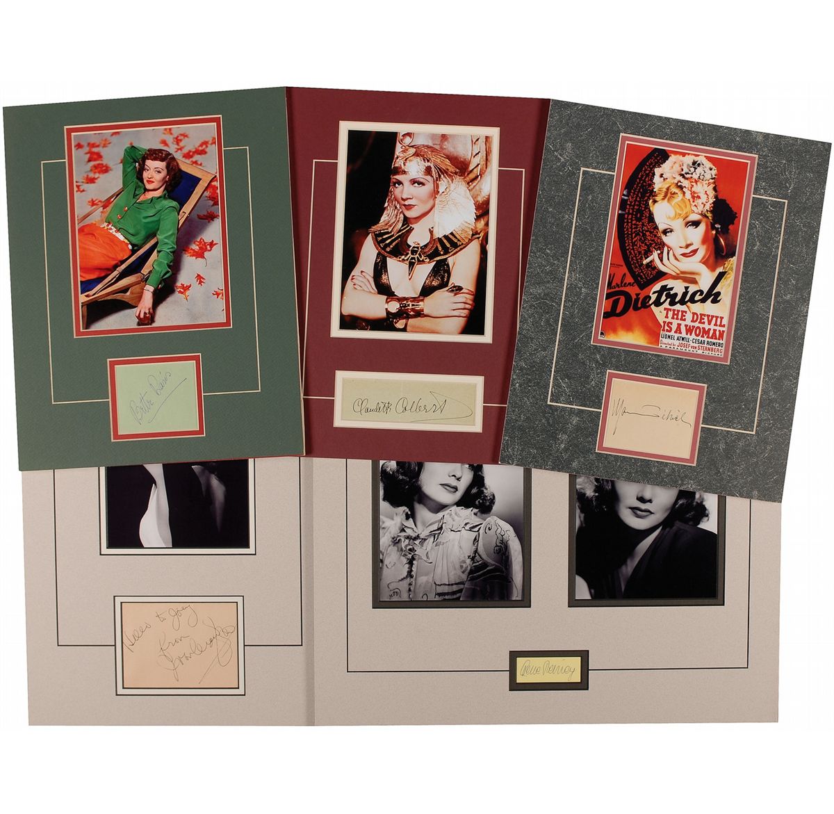 Ink and ballpoint signatures of Claudette Colbert, Bette Davis, Joan Crawford (ins), Marlene Dietrich, and Gene Tierney on various color album pages and cards. Each is individually double matted with a portrait of the respective actress to sizes ranging from 11 x 14 up to 18 x 14. In fine overall condition.