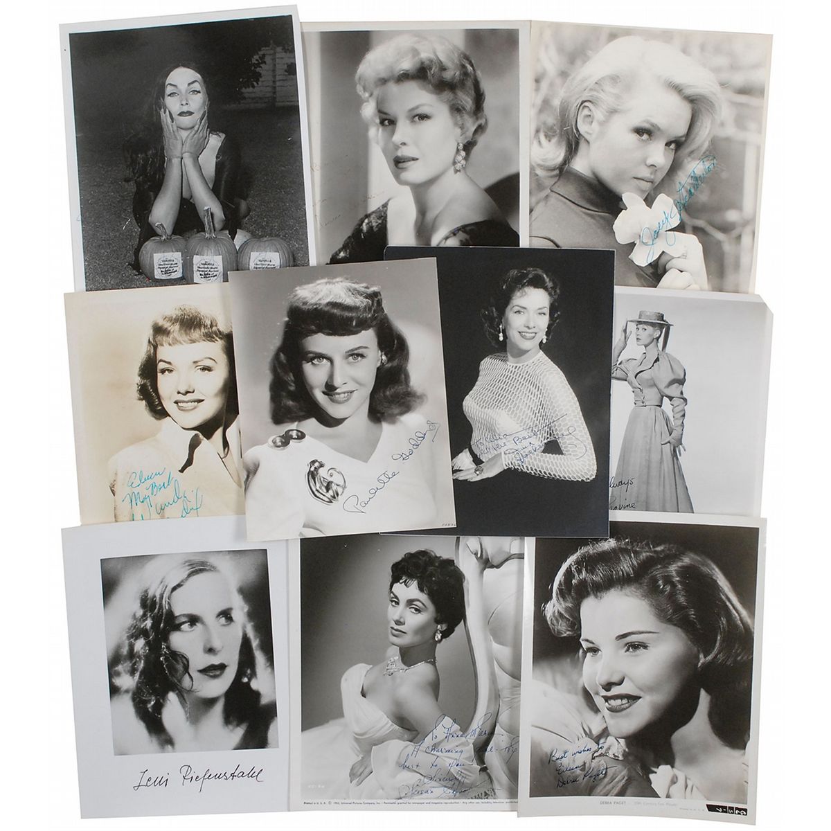 Eleven vintage photos of various finishes, 6.75 x 9 to 8 x 10, each signed in ink by the actress pictured. Signers are: Susan Cabot (ins), Leni Riefenstahl, Paulette Goddard, Jean Willes (ins), Joey Heatherton, Wanda Hendrix (ins), Jinx Falkenburg (ins), Dorothy Provine (ins), Debra Paget (ins), Carol Burnett, and Vampira. In overall fine condition, with some light contrast and skipping to a few signatures.