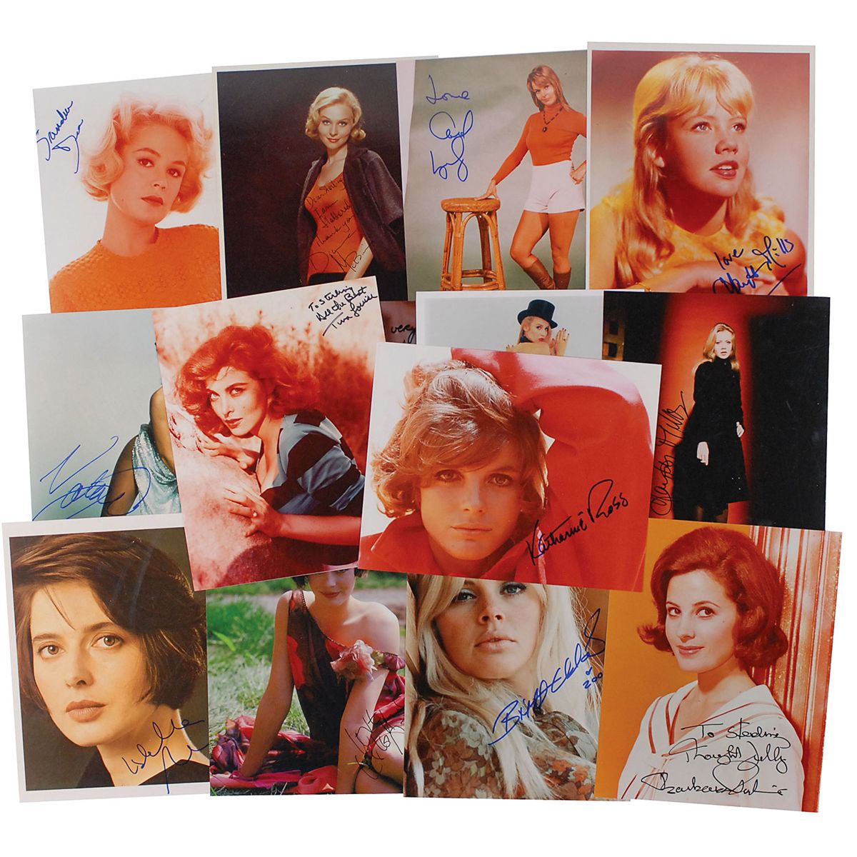 Fourteen color glossy photos, thirteen 8 x 10 and one 10 x 8, each signed in ink or felt tip by the actress pictured, with several inscribed. Signers are: Jacqeuline Bisset, Sandra Dee, Lesley-Anne Down, Britt Ekland, Jerry Hall, Tina Louise, Carol Lynley, Diane McBain, Hayley Mills (2), Barbara Parkins, Valerie Perrine, Katharine Ross, and Isabella Rossellini. In fine condition.