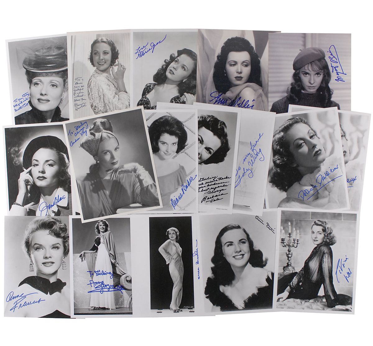Collection of twenty 8 x 10 photos, various finishes, each signed in ink or felt tip by the actress pictured, with several inscribed. Signers are: Diane Baker, Janet Blair, Grace Bradley, Danielle Darrieux (2), Irene Dunne, Deanna Durbin, Anne Francis, Anne Gwynne, Barbara Hale, Gloria Jean, Andrea King, Abbie Lane, Ann Miller, Patricia Neal, Margaret O’Brien, Eleanor Powell, Gena Rowlands, Martha Scott, and Toby Wing. In fine condition.