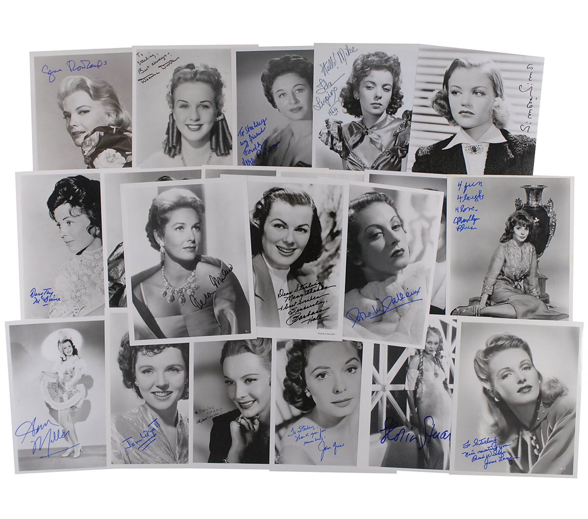 Collection of twenty 8 x 10 photos, various finishes, each signed in ink or felt tip by the actress pictured, with several inscribed. Signers are: Danielle Darrieux, Deanna Durbin, Edith Fellows, Jane Greer, Anne Gwynne, Barbara Hale, Signe Hasso, June Lang, Ida Lupino, Dorothy McGuire, Patricia Medina, Vera Miles, Ann Miller, Vera Ralston, Madlyn Rhue, Gena Rowlands, Simone Simon, Gloria Stuart, Ruth Terry, and Jane Wyatt. In fine condition.