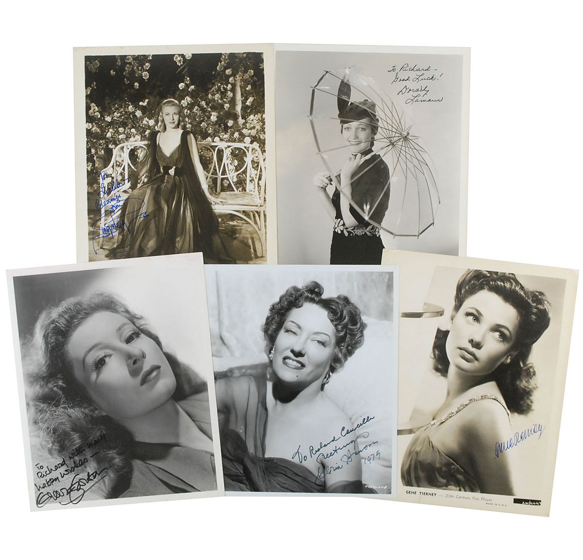 Five 8 x 10 photos, each signed in ink or felt tip by the actress pictured. Signers are: Ginger Rogers (ins), Greer Garson (ins), Dorothy Lamour (ins), Gloria Swanson (ins), and Gene Tierney. Some scattered light surface marks and streaks to a few of the photos, otherwise fine condition.