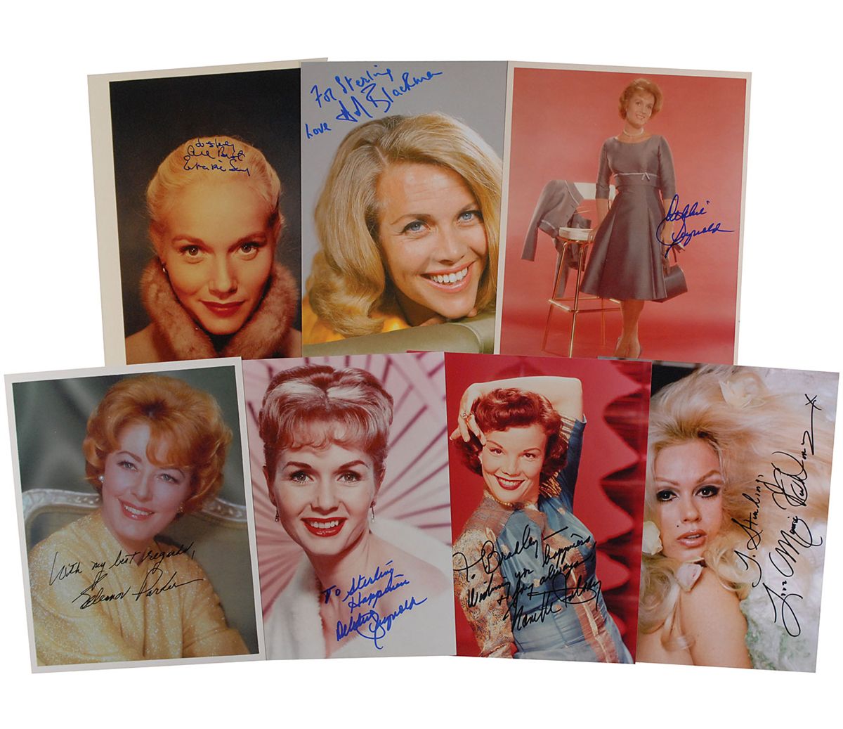 Collection of seven glossy photos, 8 x 10 and 10 x 8, each signed in felt tip by the actress pictured. Signers are: Debbie Reynolds (ins), Mamie Van Doren (ins), Honor Blackman (ins), Nanette Fabray (ins), Debbie Reynolds, Eleanor Parker, and Eva Marie Saint (ins). In fine condition.