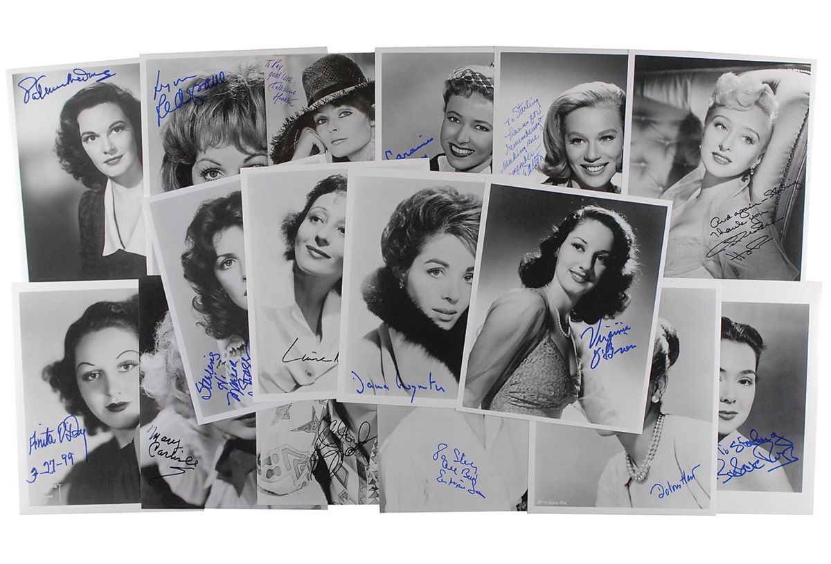 Collection of 16 photos, various finishes, each signed in ink or felt tip by the actress pictured. Signers are: Mary Carlisle, Abby Dalton (ins), Laraine Day, Dolores Hart, Celeste Holm (ins), Katharine Houghton, Shirley MacLaine, Patricia Medina, Virginia O’Brien, Anita O’Day, Luise Rainer, Lynn Redgrave, Barbara Rush (ins), Eva Marie Saint, Marcia Strassman, and Dana Wynter. In fine condition.