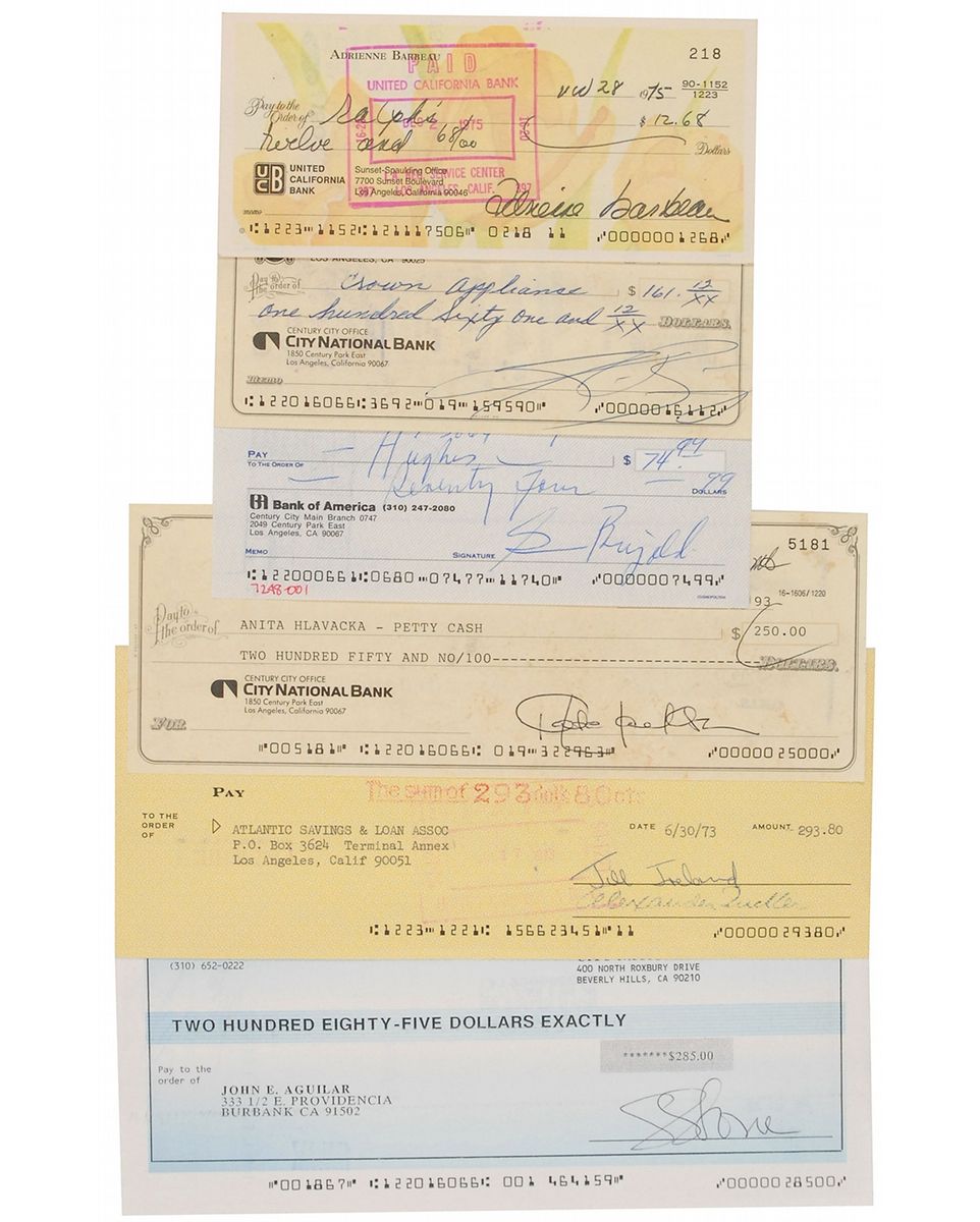 Collection of six checks, each signed by an actress, including: Sharon Stone, Kate Jackson, Kim Basinger, Jill Ireland, Genevieve Bujold, and Adrienne Barbeau. In overall fine condition, with expected bank stamps.